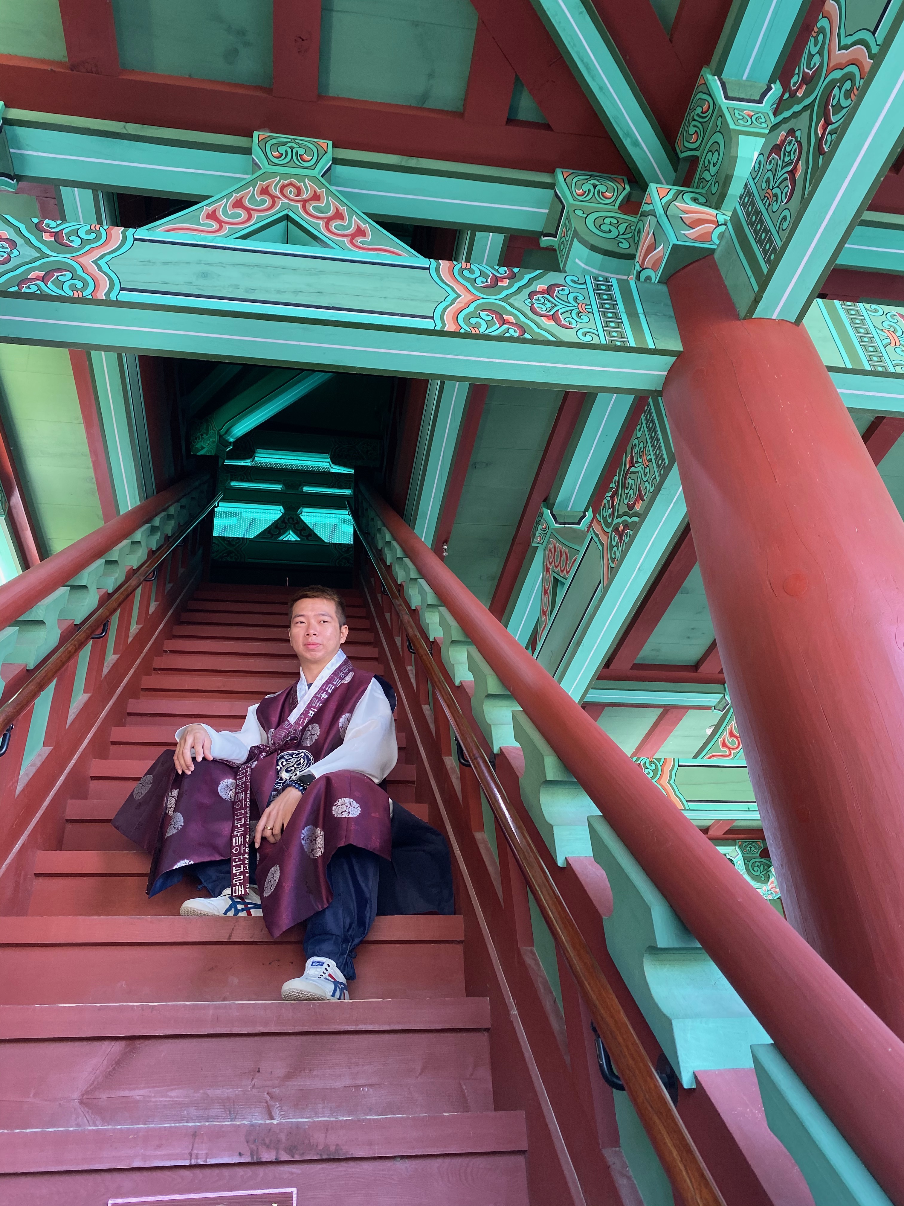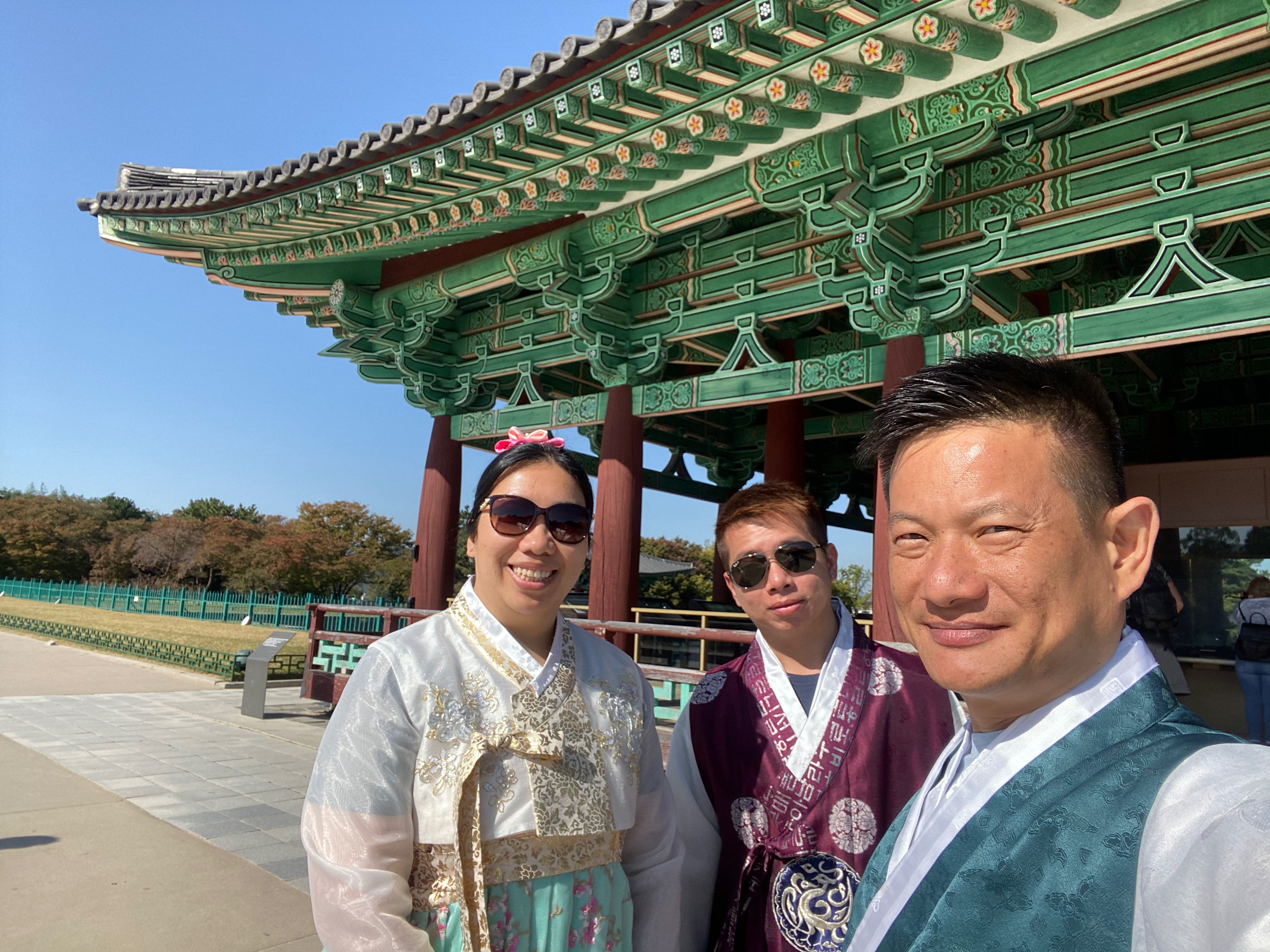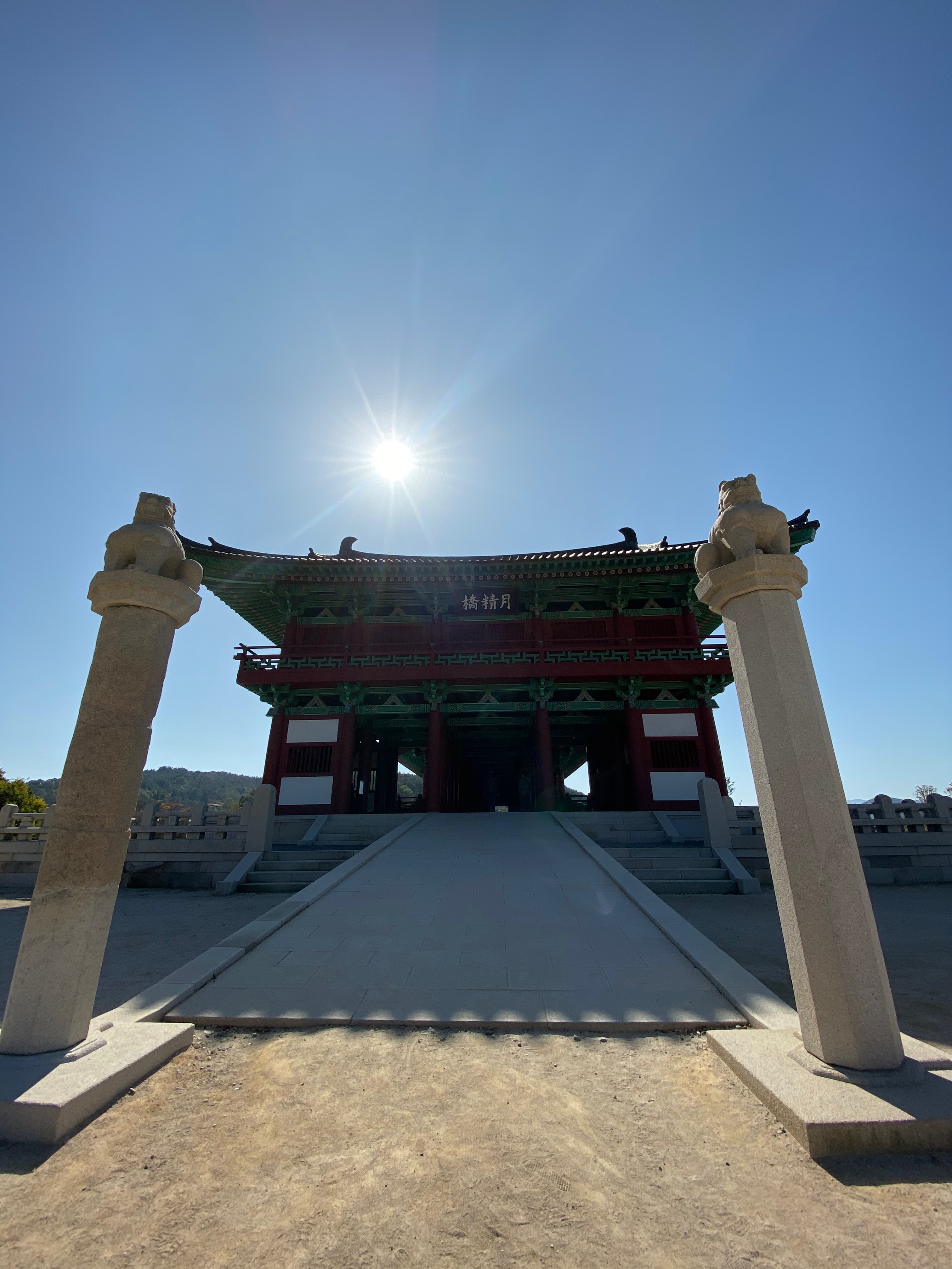 Taking a wefie in the pavilion with Hwaseomun in the background