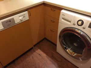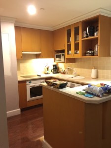 Next to the living room is the kitchen, separated by a kitchen counter which also doubles up as storage space for your daily shopping or food. The kitchen is fully equipped with over, stove, microwave oven a dishwasher as well as a large full fridge. The kitchen is also fully furnished with cutlery and dining set for four. On top of that, there are also cooking utensils such as pots and pans, kitchen scissors and knife neatly stored inside the cabinets in the kitchen area. The kitchen also comes with a sink for guests who chose to wash their dishes after using them. Neatly tucked in the corner is where a set of six mugs and a coffee machine can be found. The electric kettle is found on the kitchen countertop that separates the kitchen area from the living room.