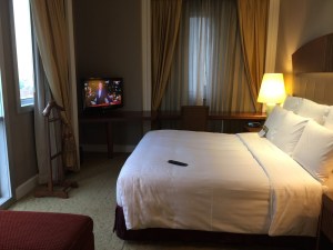 | A nice comfy king bed that provided me with a great night sleep. The placement of the TV is rather weird |