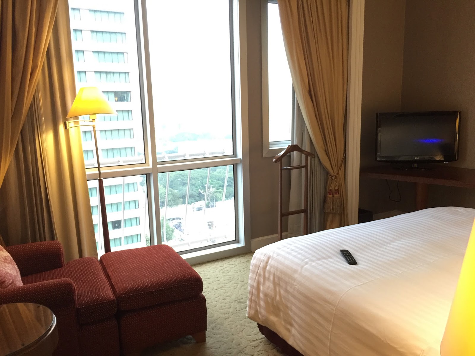 Further in the room are the bedrooms. Furthest into the suite is where the Master Bedroom is located. From the entrance to the bedroom, a maroon armchair with a footrest immediately caught my eye. This chair is placed in a corner of the room, that does not sacrifice walking space. I welcome the small coffee table beside the armchair as it provides space for one to lounge in the chair drinking a cup of coffee or tea. On the right of the entrance to the Master Bedroom is where one can find the King Bed. The King bed is placed facing the ceiling to floor window, giving one a sense of spaciousness, other than allowing its occupants to look out into the streets of Bangkok. As one would expect, there are a couple of bedside tables on either side of the King Bed. The King bed is very comfortable and provided me with quality sleep throughout the night, the bed is large enough to sleep three adults. Furthest to the corner of the room is a work desk, where one can find the only power socket outlets in the room, tucked in one corner. For those who prefer to have their lifestyle devices by their side while sleeping would find this arrange a tad inconvenient. The TV in the Master Bedroom is placed on top of this work desk, angled to face the TV.