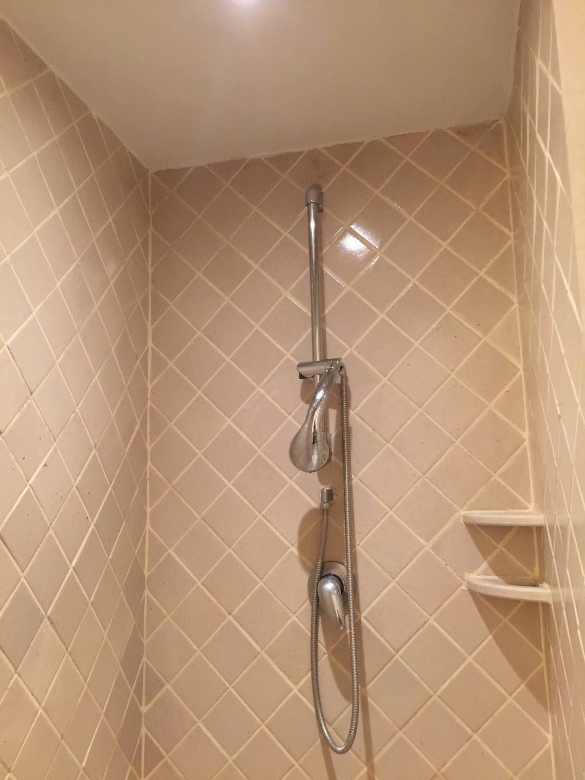 | Walk-in shower and toilet bowl. The toilet bowl is hidden behind the door to the bathroom when opened |