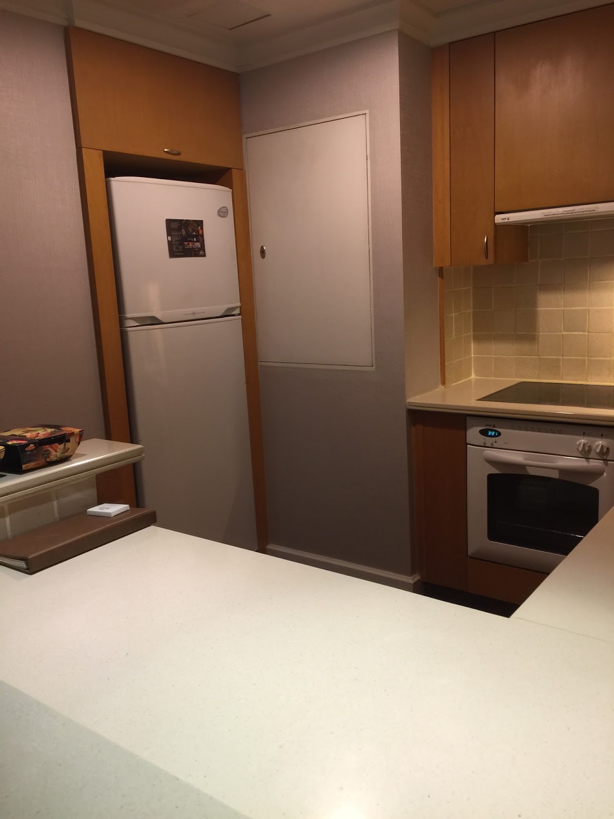 Next to the living room is the kitchen, separated by a kitchen counter which also doubles up as storage space for your daily shopping or food. The kitchen is fully equipped with over, stove, microwave oven a dishwasher as well as a large full fridge. The kitchen is also fully furnished with cutlery and dining set for four. On top of that, there are also cooking utensils such as pots and pans, kitchen scissors and knife neatly stored inside the cabinets in the kitchen area. The kitchen also comes with a sink for guests who chose to wash their dishes after using them. Neatly tucked in the corner is where a set of six mugs and a coffee machine can be found. The electric kettle is found on the kitchen countertop that separates the kitchen area from the living room.