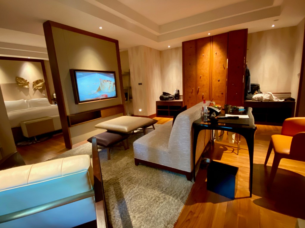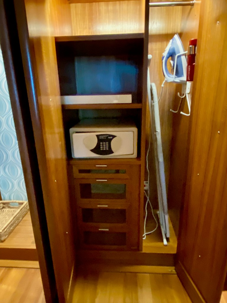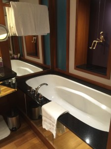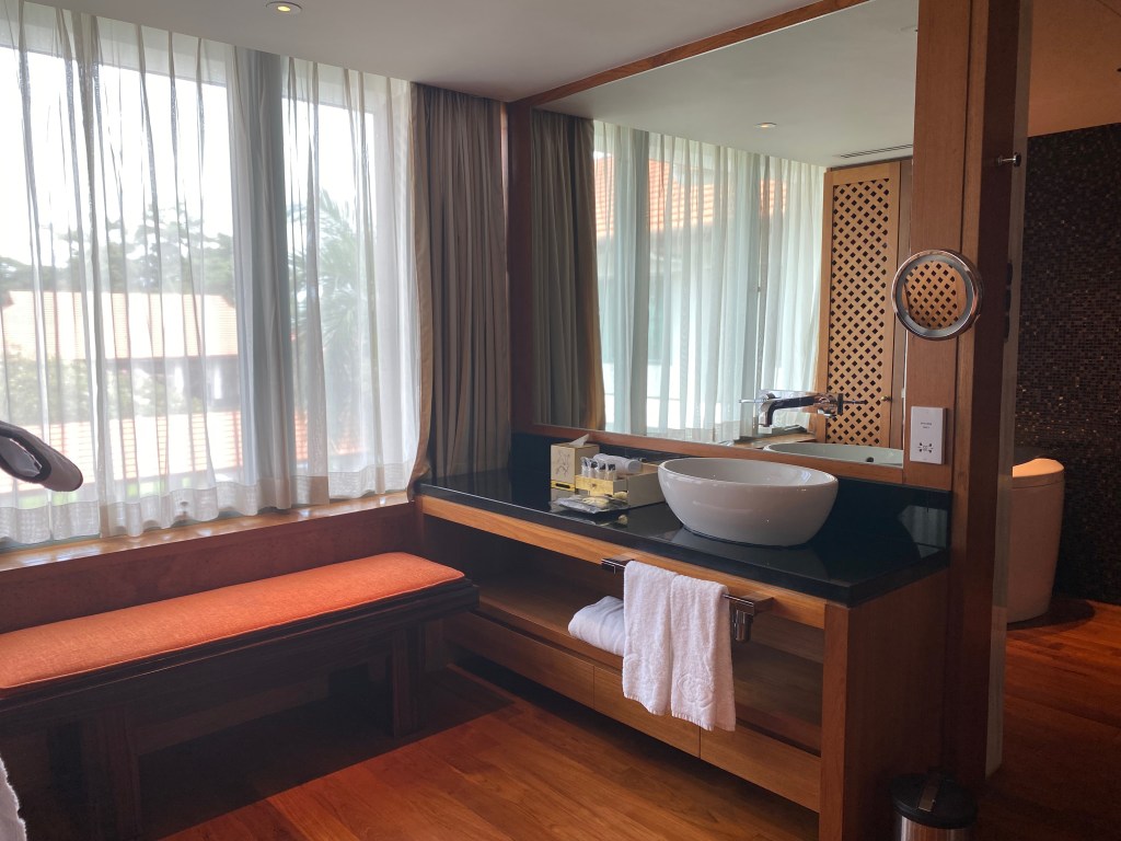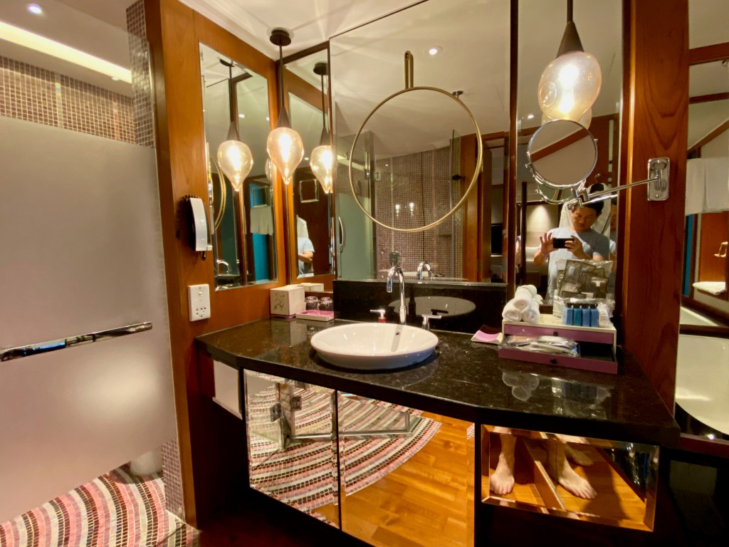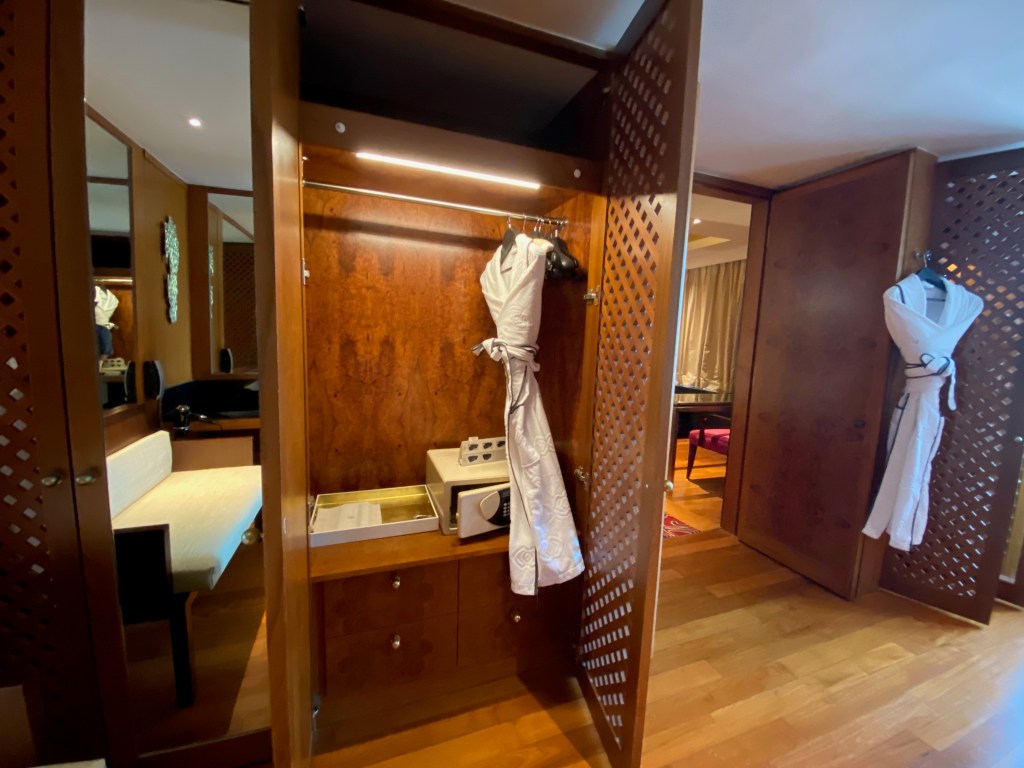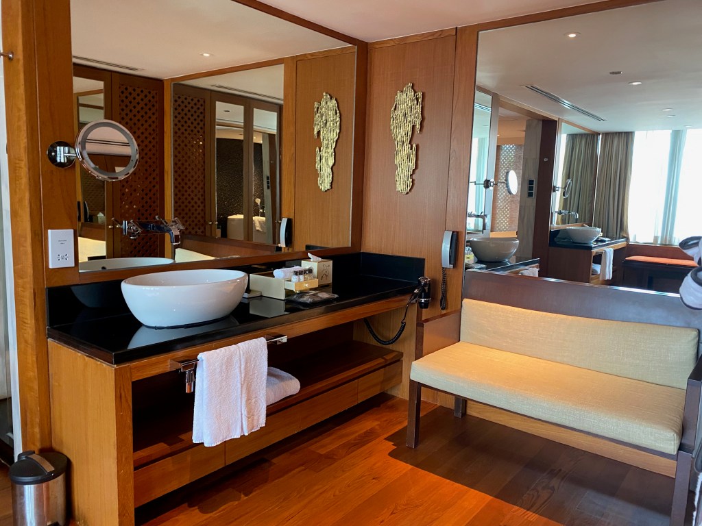 A long carpet from the bedroom extends to the very spacious master bathroom. The two his and hers sinks sitting on the walls across each other can be seen from the entrance to the bathroom. Despite being occupied by a large sink, there is still an abundance of space on both sink countertops to place our facial products. A small two-tiered drawer houses the bathroom amenities and occupies a relatively small space on the sink. The sink area also doubles up as a walk-in closet, where two large wardrobes occupy the space behind each of the sinks. With a knee-high dresser that doubles as a luggage rack, we found lots of space to put away our clothing and luggage. The design of these wardrobes is similar, with the only exception being the length of the built-in drawer. One of these wardrobes features a drawer occupying the entire length of the wardrobe, while the other has the drawers occupying about ⅔ of the space. The in-room safe is found hidden in one of these wardrobes.