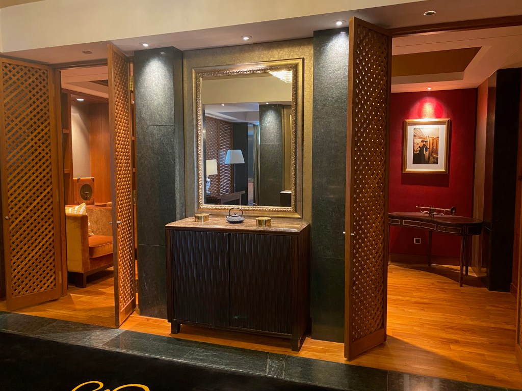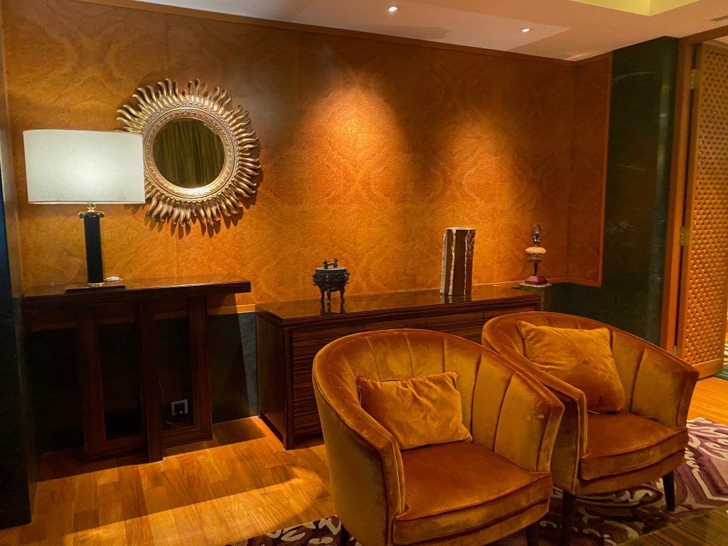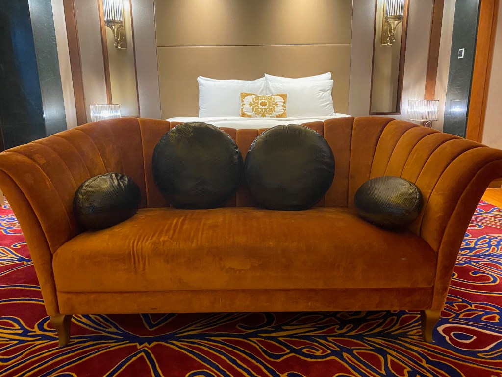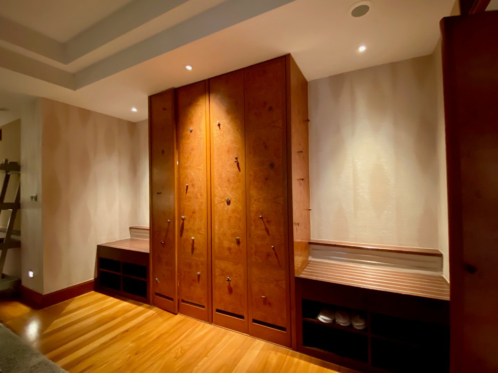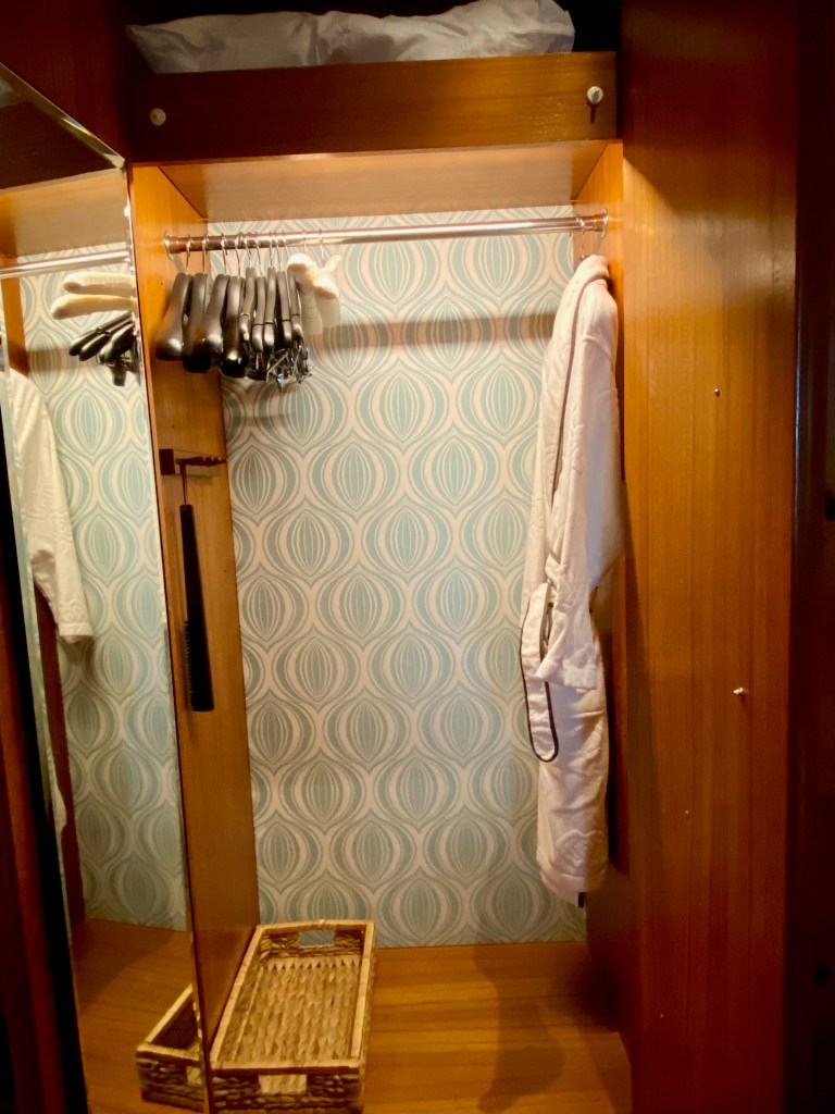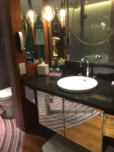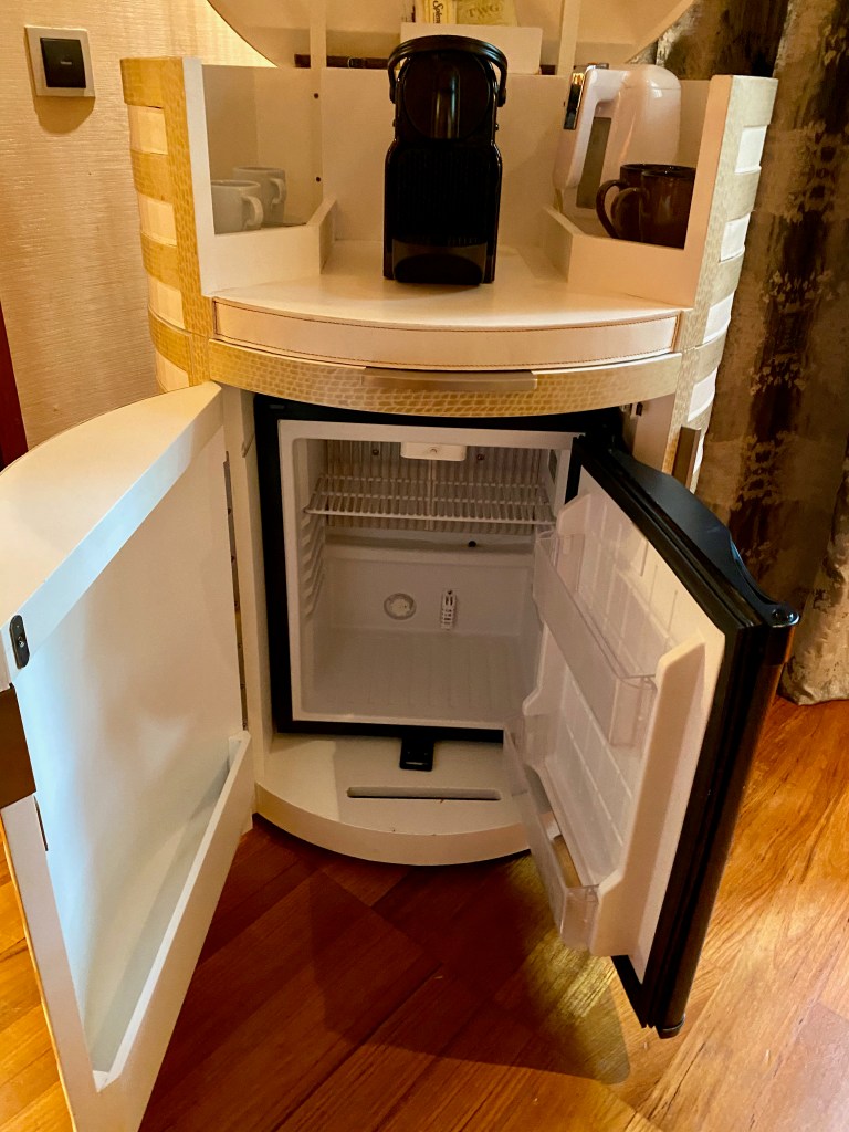 A long carpet from the bedroom extends to the very spacious master bathroom. The two his and hers sinks sitting on the walls across each other can be seen from the entrance to the bathroom. Despite being occupied by a large sink, there is still an abundance of space on both sink countertops to place our facial products. A small two-tiered drawer houses the bathroom amenities and occupies a relatively small space on the sink. The sink area also doubles up as a walk-in closet, where two large wardrobes occupy the space behind each of the sinks. With a knee-high dresser that doubles as a luggage rack, we found lots of space to put away our clothing and luggage. The design of these wardrobes is similar, with the only exception being the length of the built-in drawer. One of these wardrobes features a drawer occupying the entire length of the wardrobe, while the other has the drawers occupying about ⅔ of the space. The in-room safe is found hidden in one of these wardrobes.
