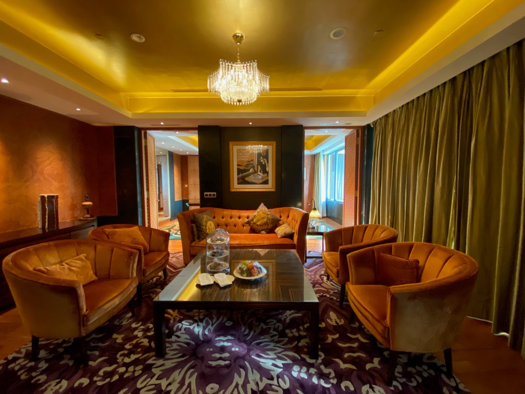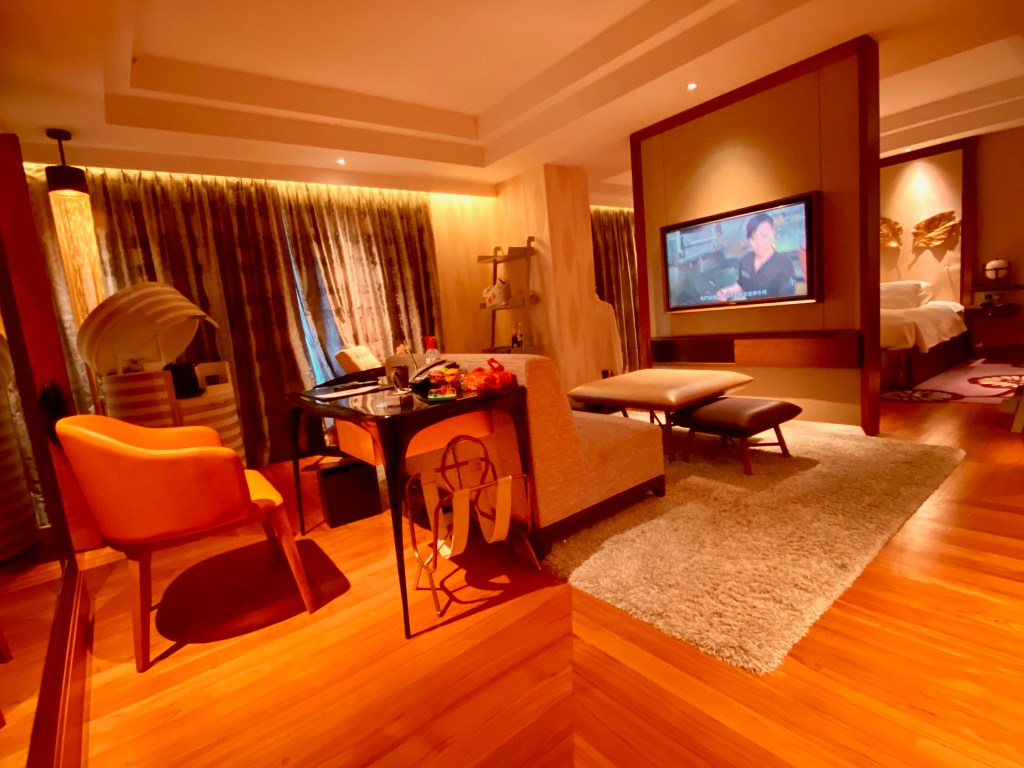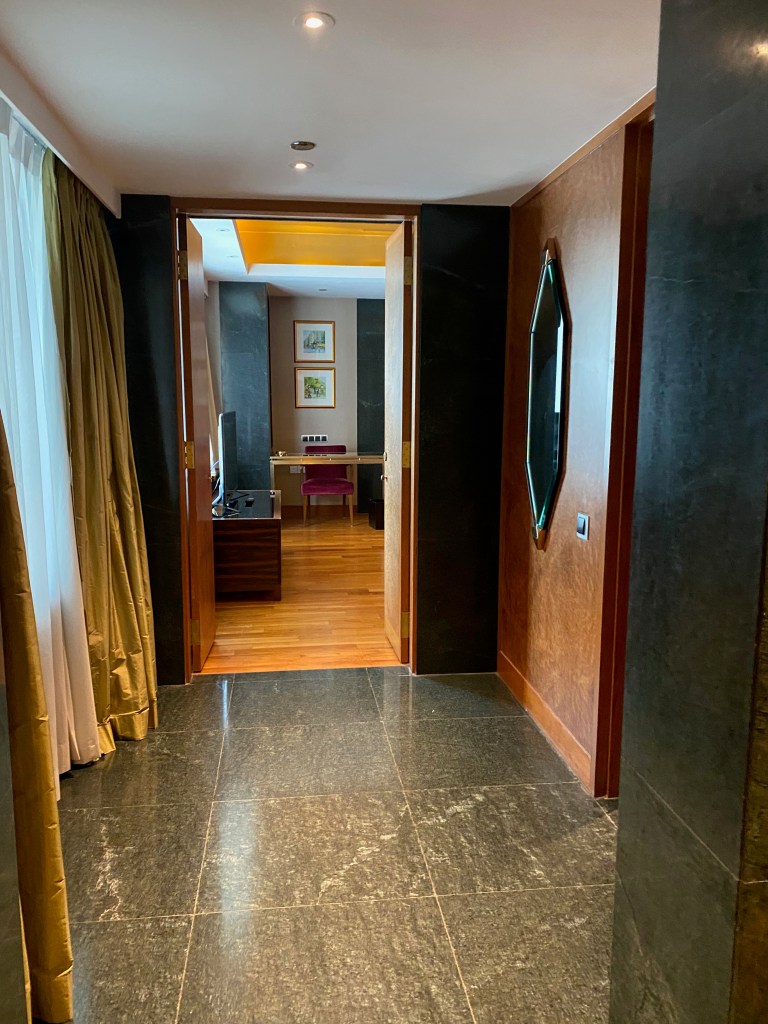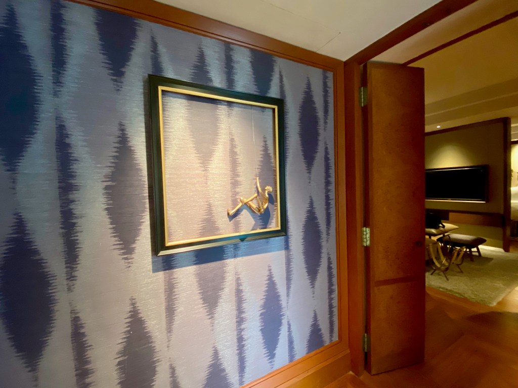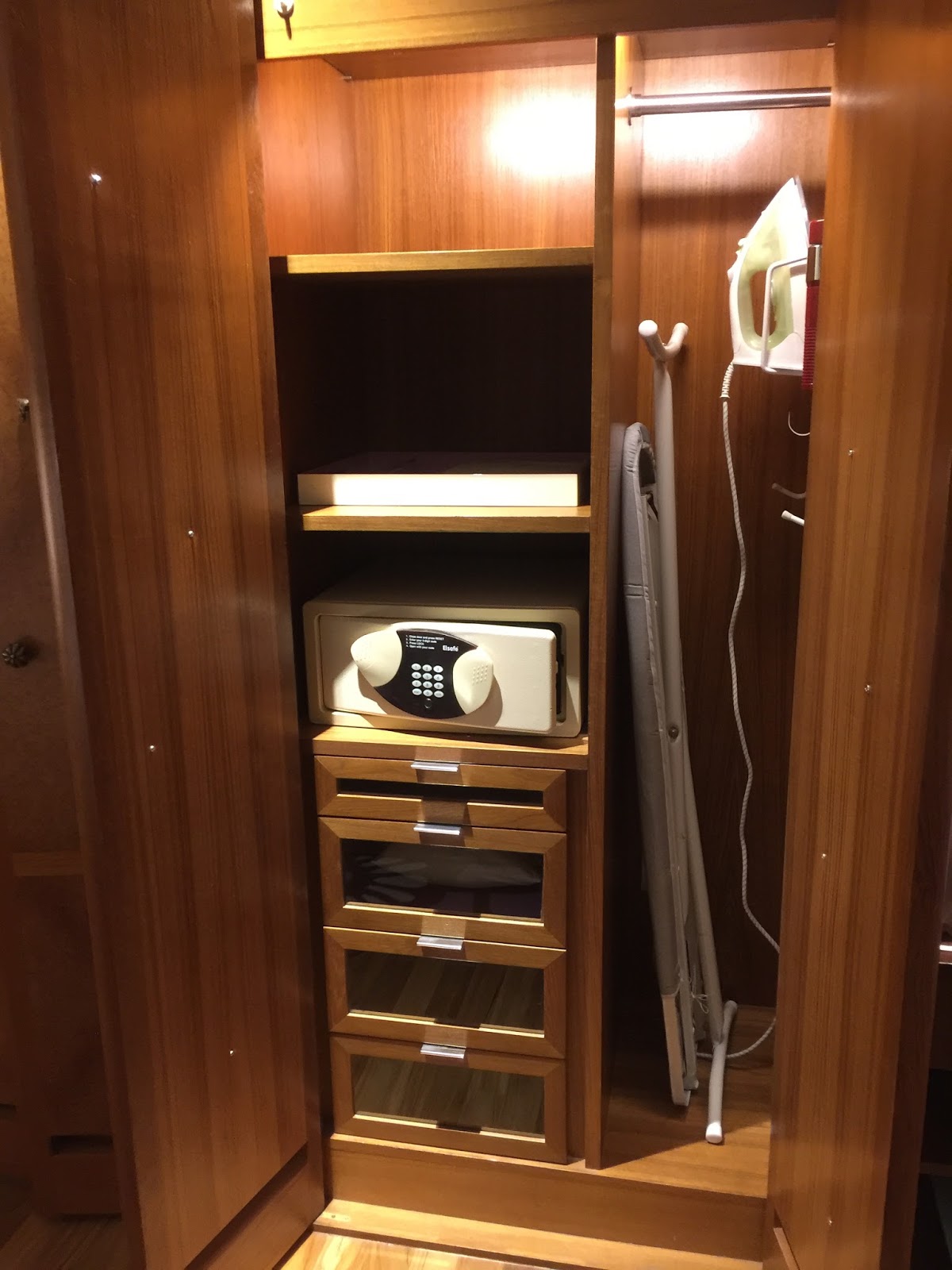 A long carpet from the bedroom extends to the very spacious master bathroom. The two his and hers sinks sitting on the walls across each other can be seen from the entrance to the bathroom. Despite being occupied by a large sink, there is still an abundance of space on both sink countertops to place our facial products. A small two-tiered drawer houses the bathroom amenities and occupies a relatively small space on the sink. The sink area also doubles up as a walk-in closet, where two large wardrobes occupy the space behind each of the sinks. With a knee-high dresser that doubles as a luggage rack, we found lots of space to put away our clothing and luggage. The design of these wardrobes is similar, with the only exception being the length of the built-in drawer. One of these wardrobes features a drawer occupying the entire length of the wardrobe, while the other has the drawers occupying about ⅔ of the space. The in-room safe is found hidden in one of these wardrobes.