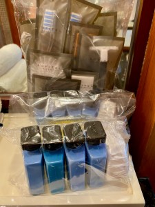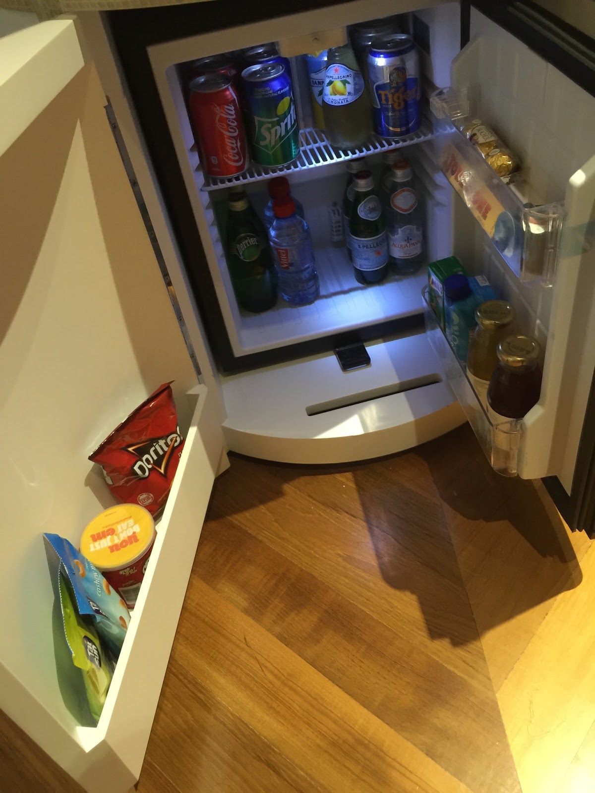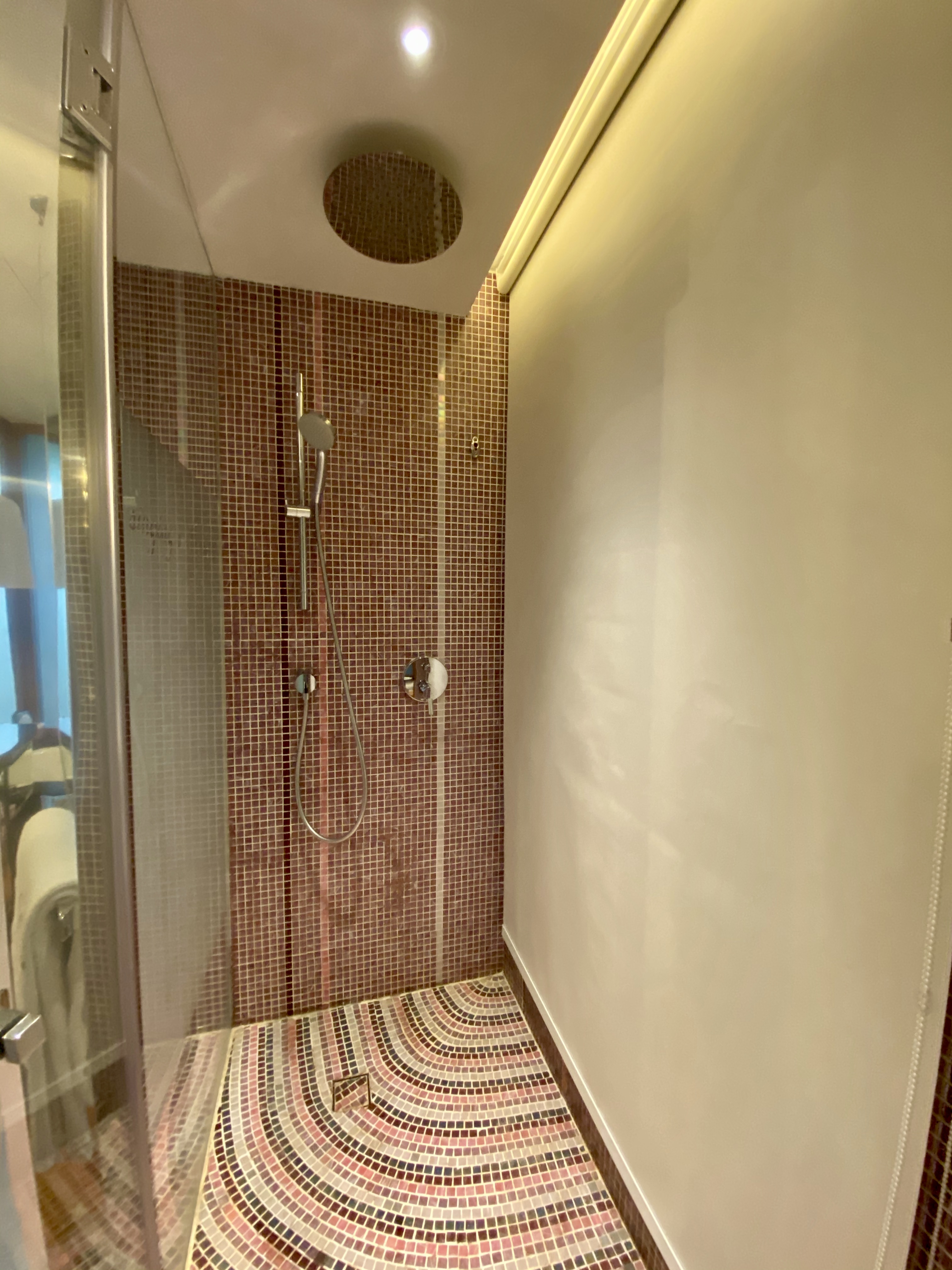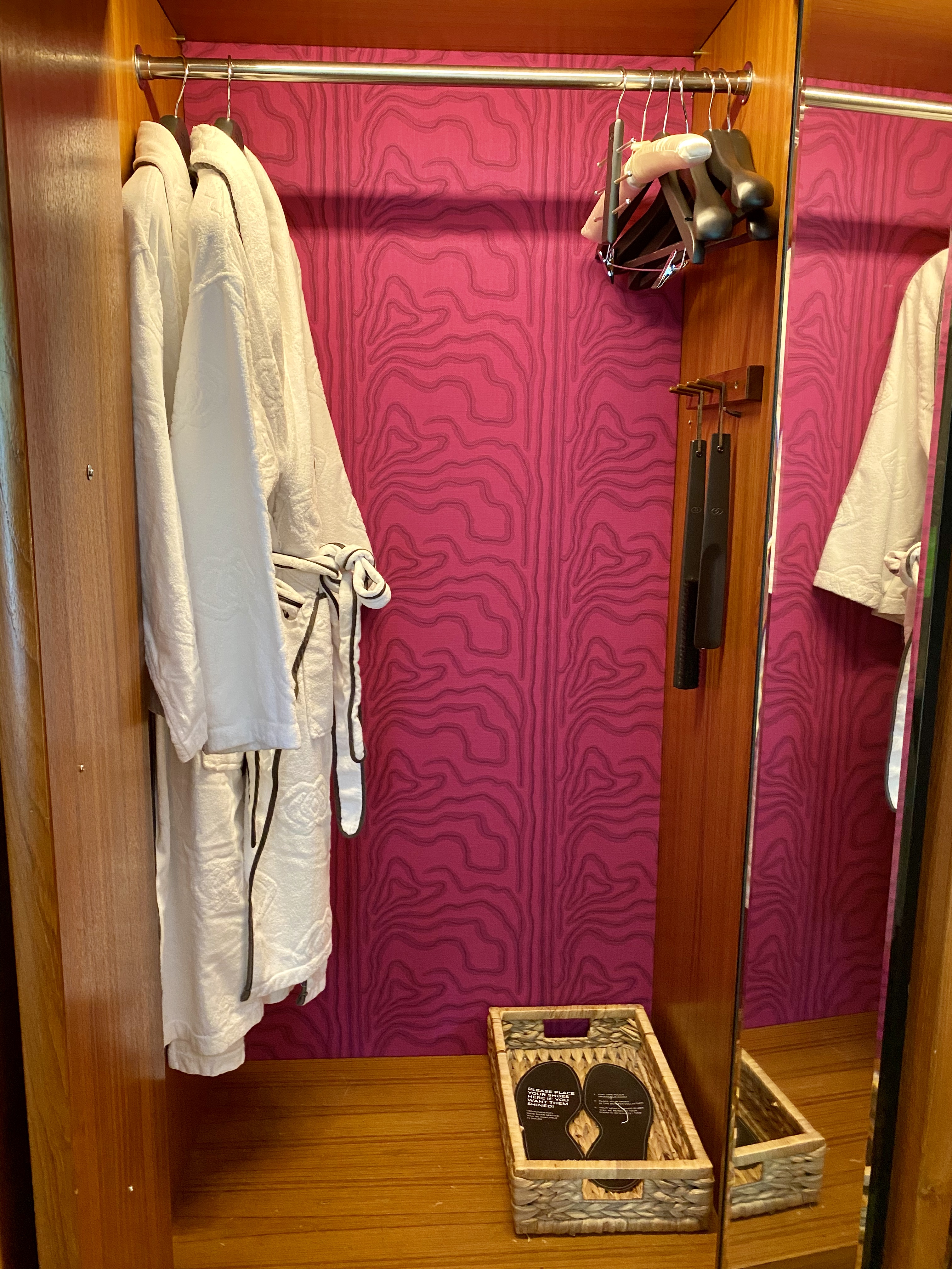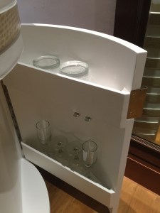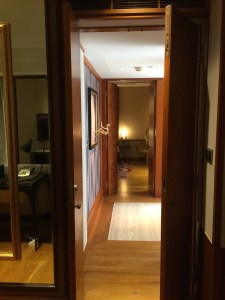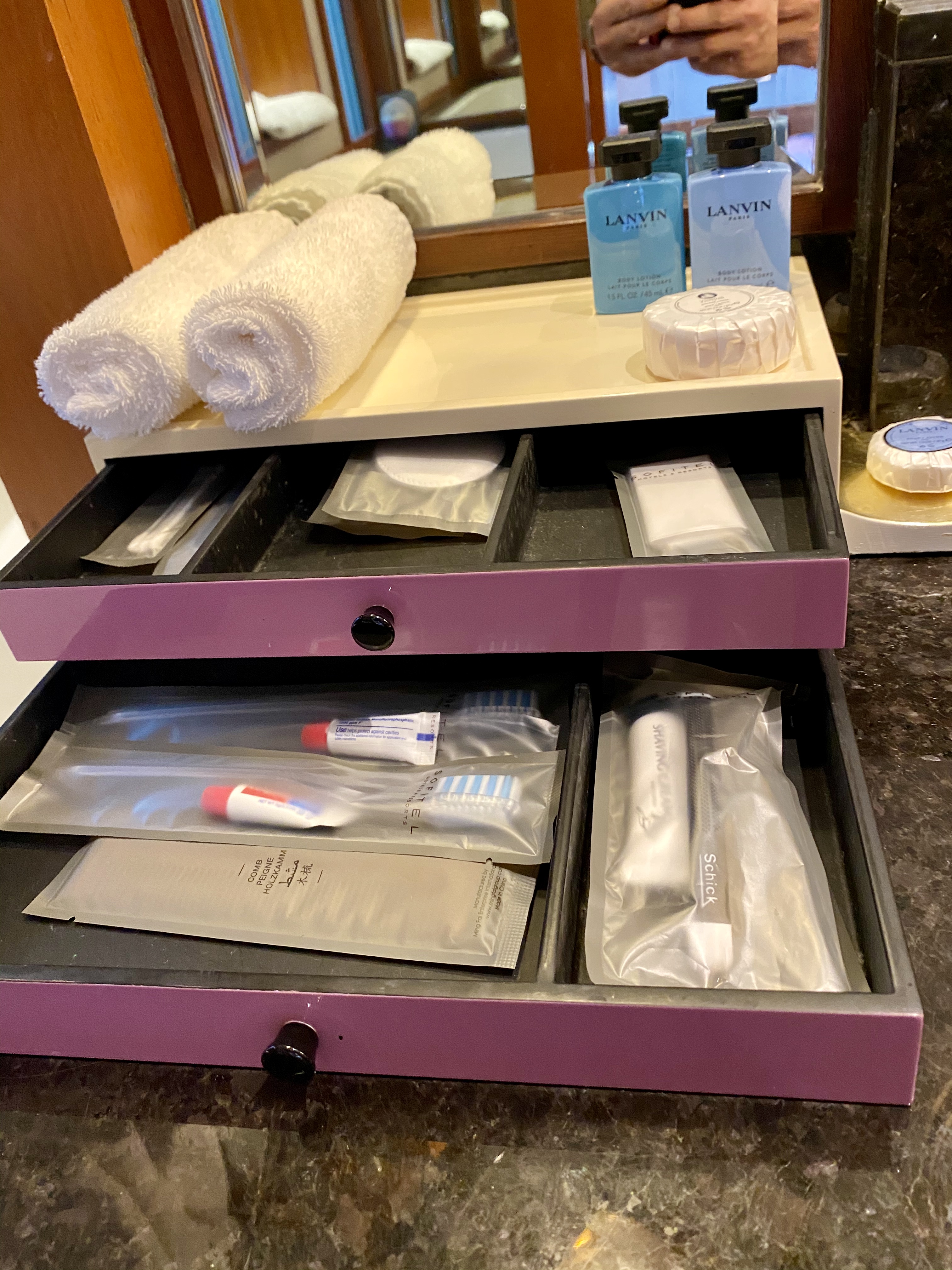 A long carpet from the bedroom extends to the very spacious master bathroom. The two his and hers sinks sitting on the walls across each other can be seen from the entrance to the bathroom. Despite being occupied by a large sink, there is still an abundance of space on both sink countertops to place our facial products. A small two-tiered drawer houses the bathroom amenities and occupies a relatively small space on the sink. The sink area also doubles up as a walk-in closet, where two large wardrobes occupy the space behind each of the sinks. With a knee-high dresser that doubles as a luggage rack, we found lots of space to put away our clothing and luggage. The design of these wardrobes is similar, with the only exception being the length of the built-in drawer. One of these wardrobes features a drawer occupying the entire length of the wardrobe, while the other has the drawers occupying about ⅔ of the space. The in-room safe is found hidden in one of these wardrobes.
