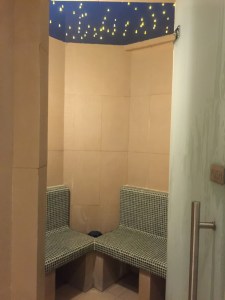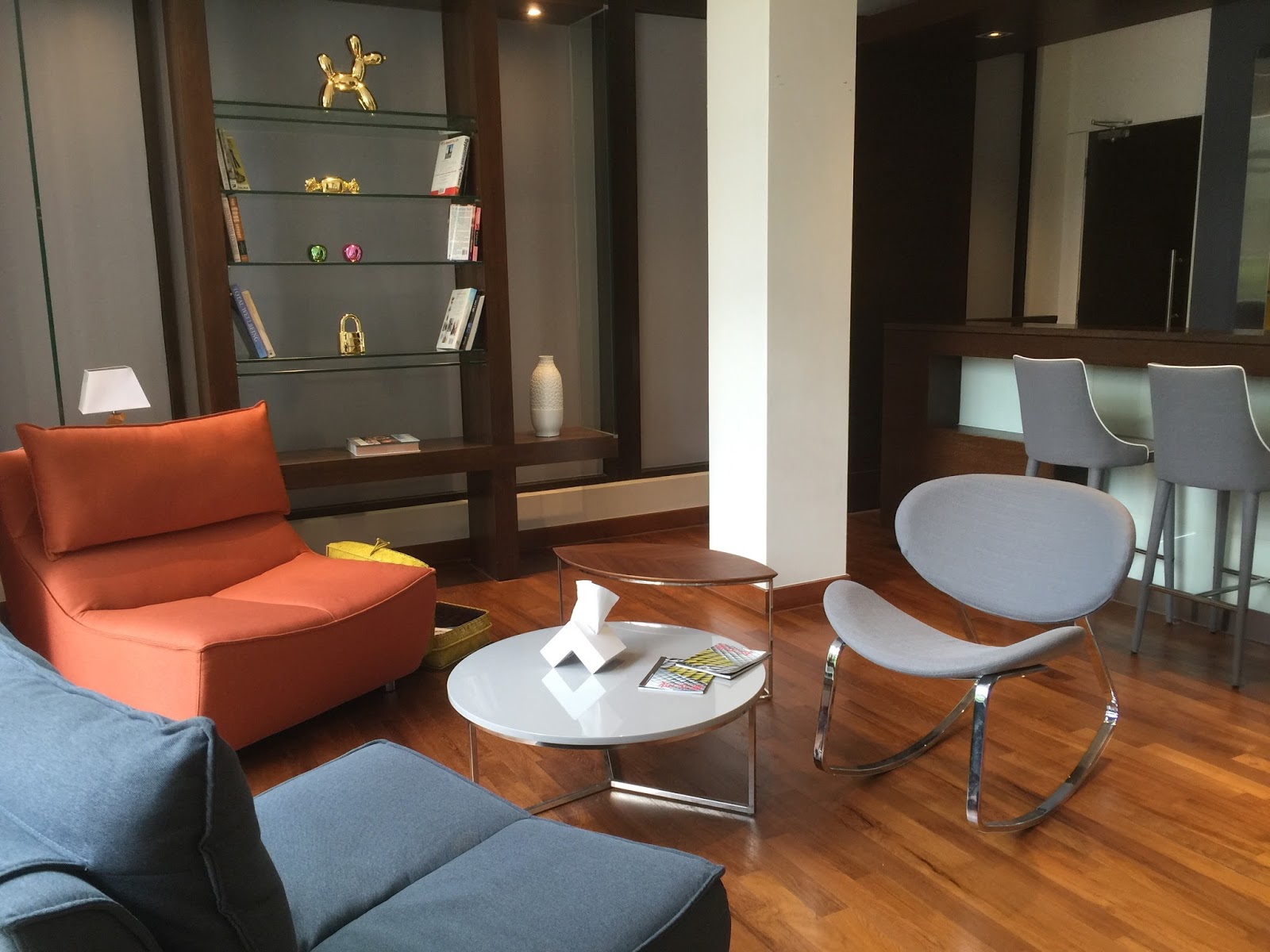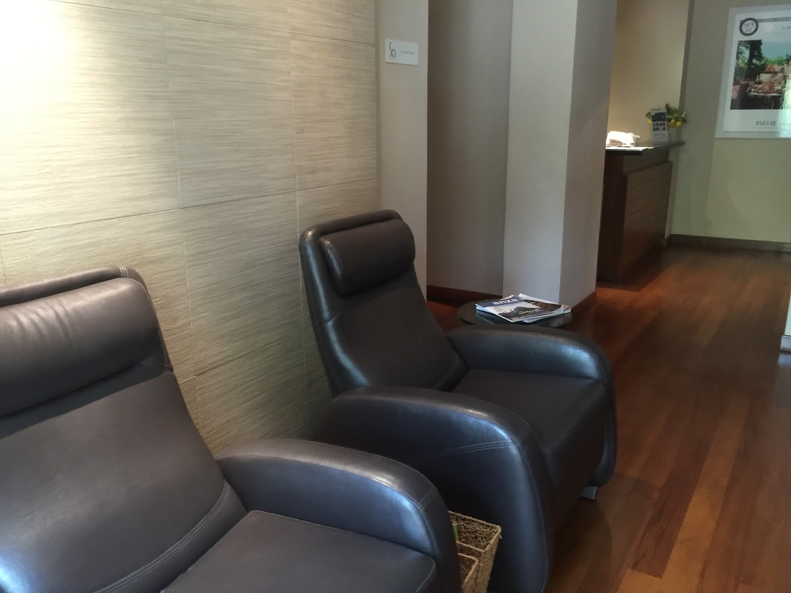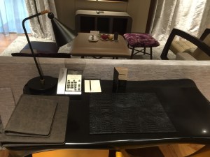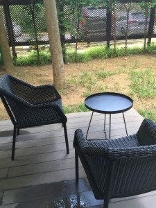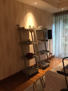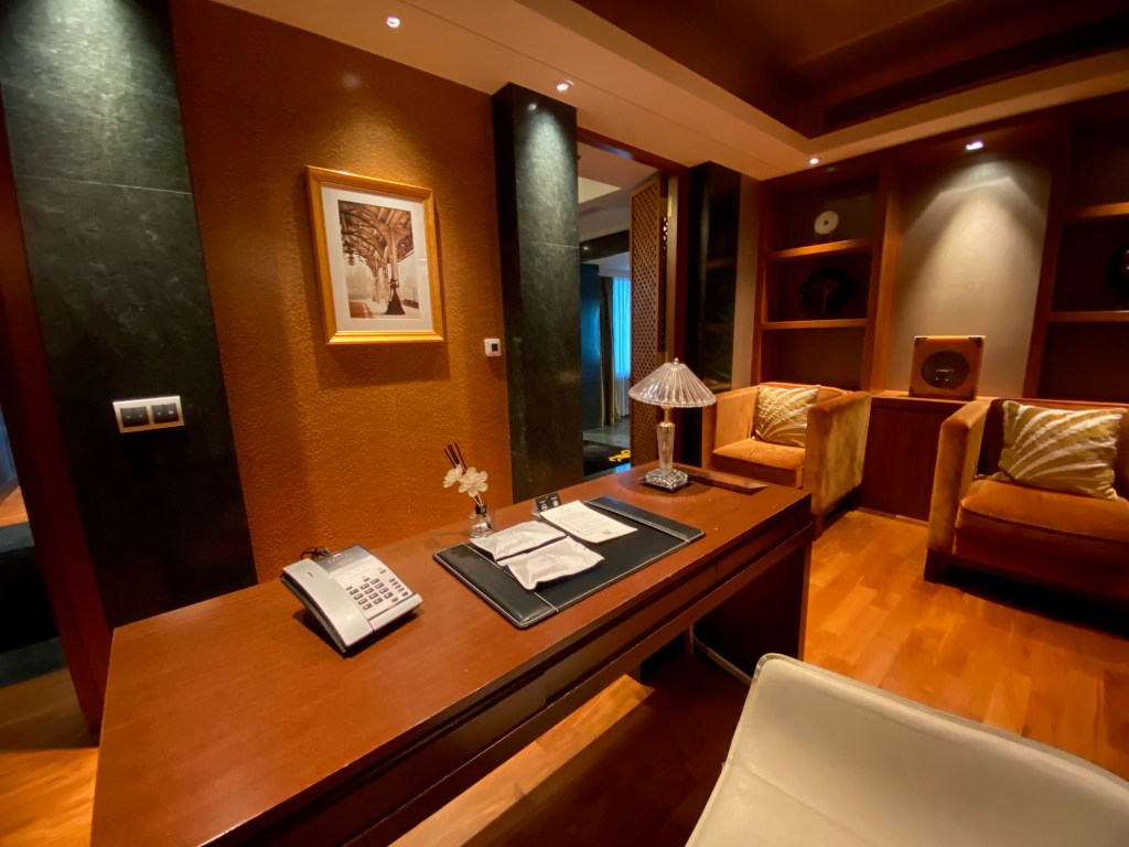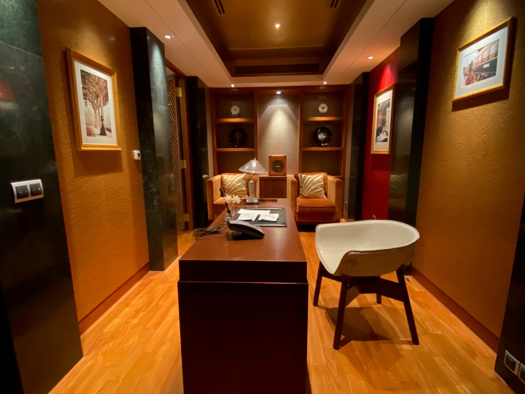 A large dark brown marble work desk occupies the space after the powder room. The large size of the table is great for work, and it has ample space to lay out documents. The work desk is so large that I was able to use it at the same time with my nephew. The easy access to a power outlet fitted next to the table allows us to continue using our lifestyle devices for a prolonged period. The placement of the work desk is next to the small garden outside the villa, where we were able to look out into the green to relax our eyes after prolonged usage of our lifestyle devices. However, the design of the chair that comes with the work desk leaves one to be desired. I found the chair was not very comfortable for longer periods.