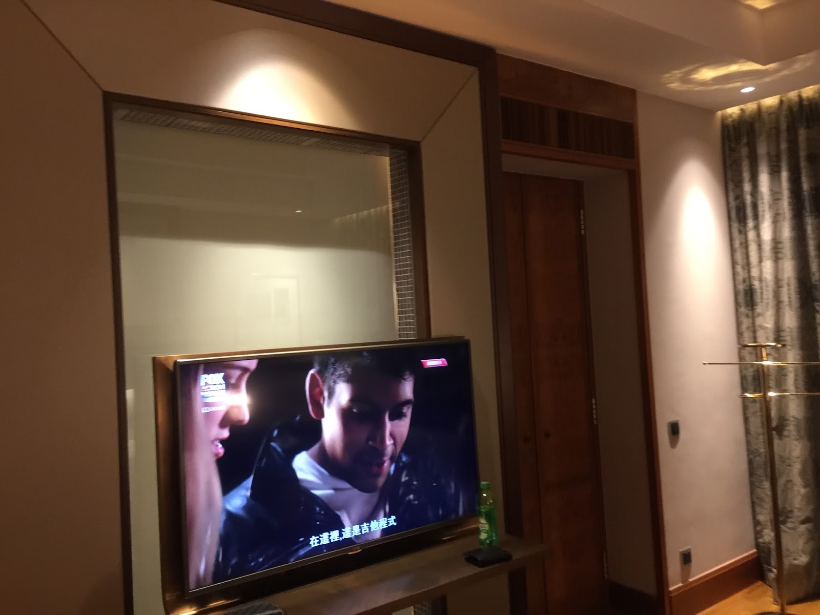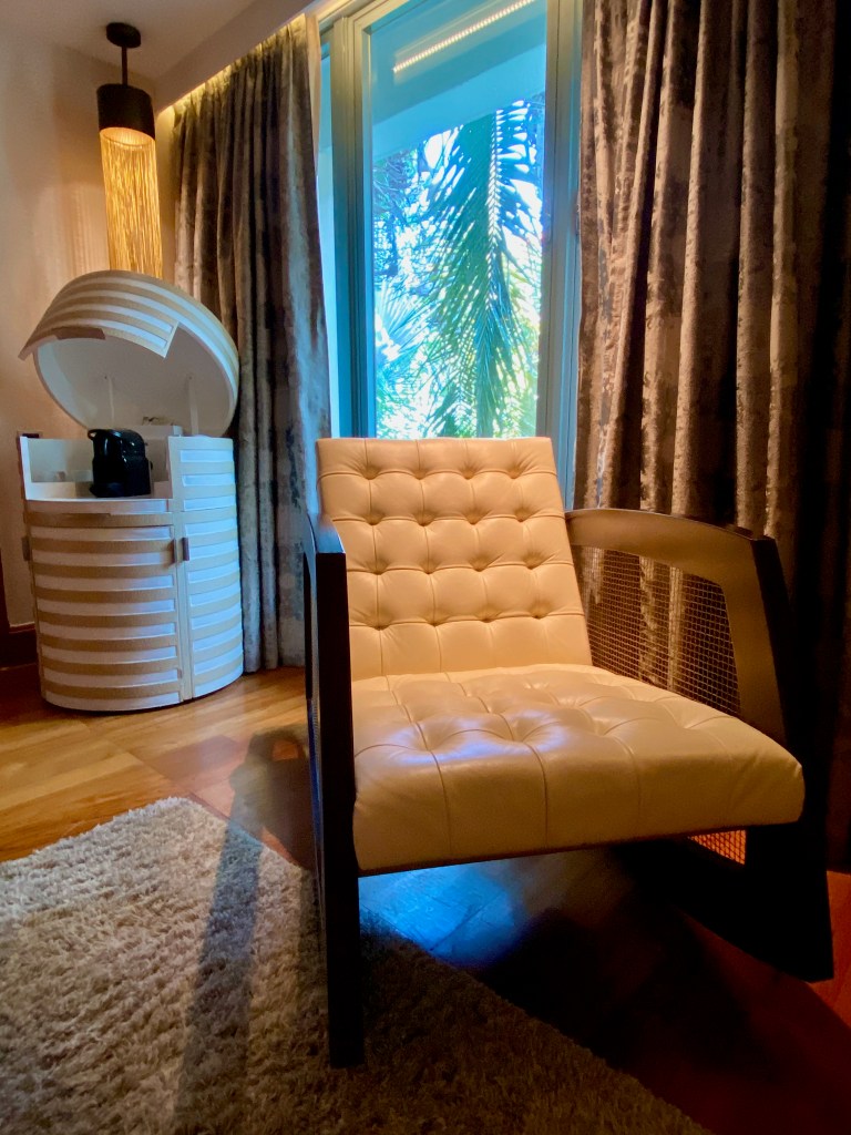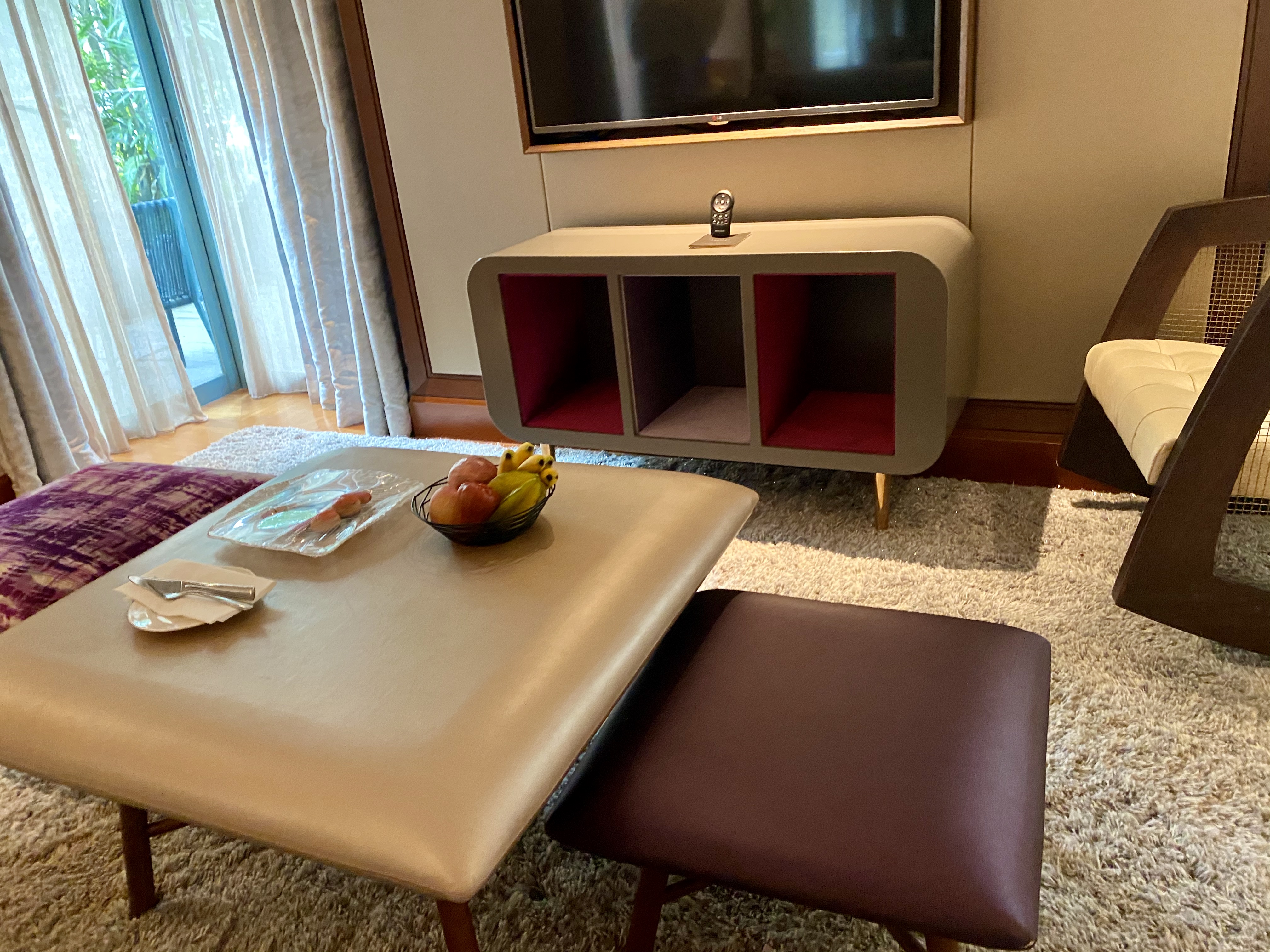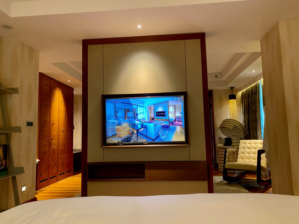 A vanity desk occupies the space between the bedside table and the bathroom. I thought the design of the vanity desk was very clever. The mirror of the desk was hidden under the tabletop, allowing this desk to double up as a work desk when the top was closed. There are power outlets under the table that allow us to use the vanity desk to charge our lifestyle devices. However, I find the placement of these power outlets rather inaccessible. Mounted on the wall opposite the king bed is the second TV in the villa, which allows us to watch from the myriad of TV channels in the comfort of the king bed. I like how the resort placed a glass-top table under the TV that fills the void and gives us additional space to stow our stuff. A red lounge chaise was placed in the corner of the bedroom, next to the floor-to-ceiling window, which is a great place to relax or to look out into the pool area of the villa.