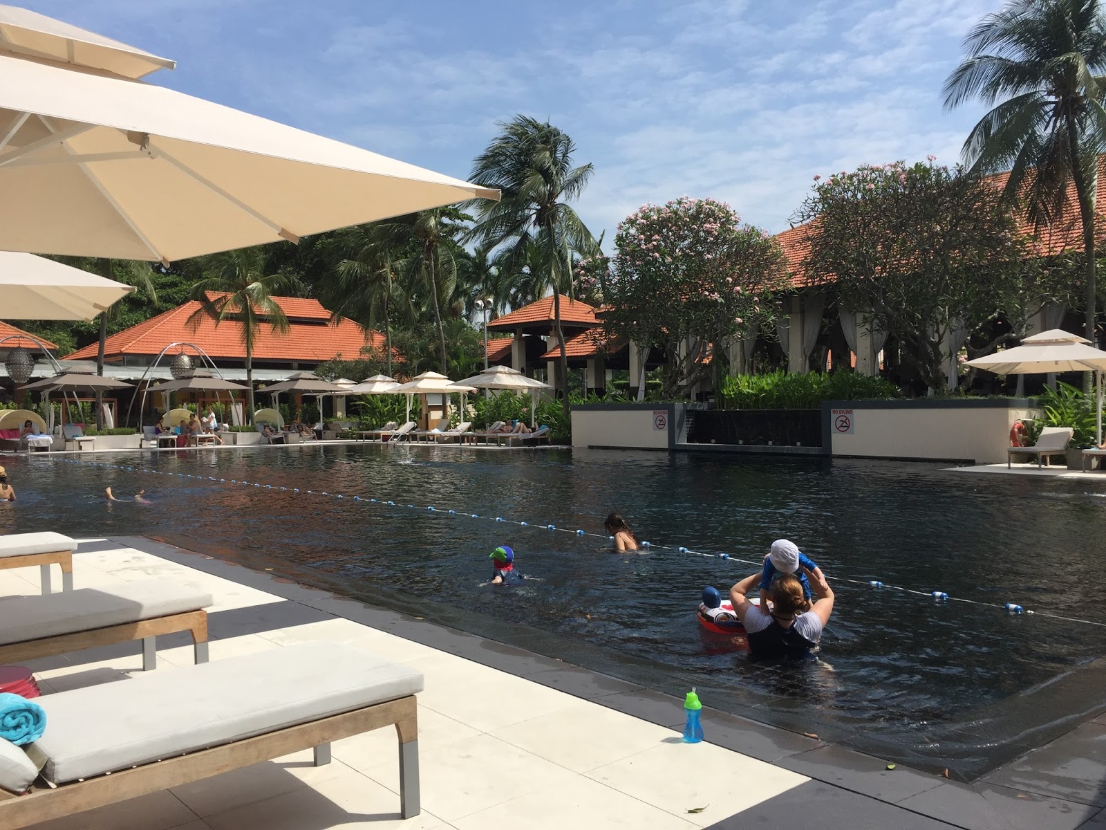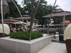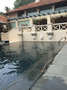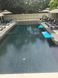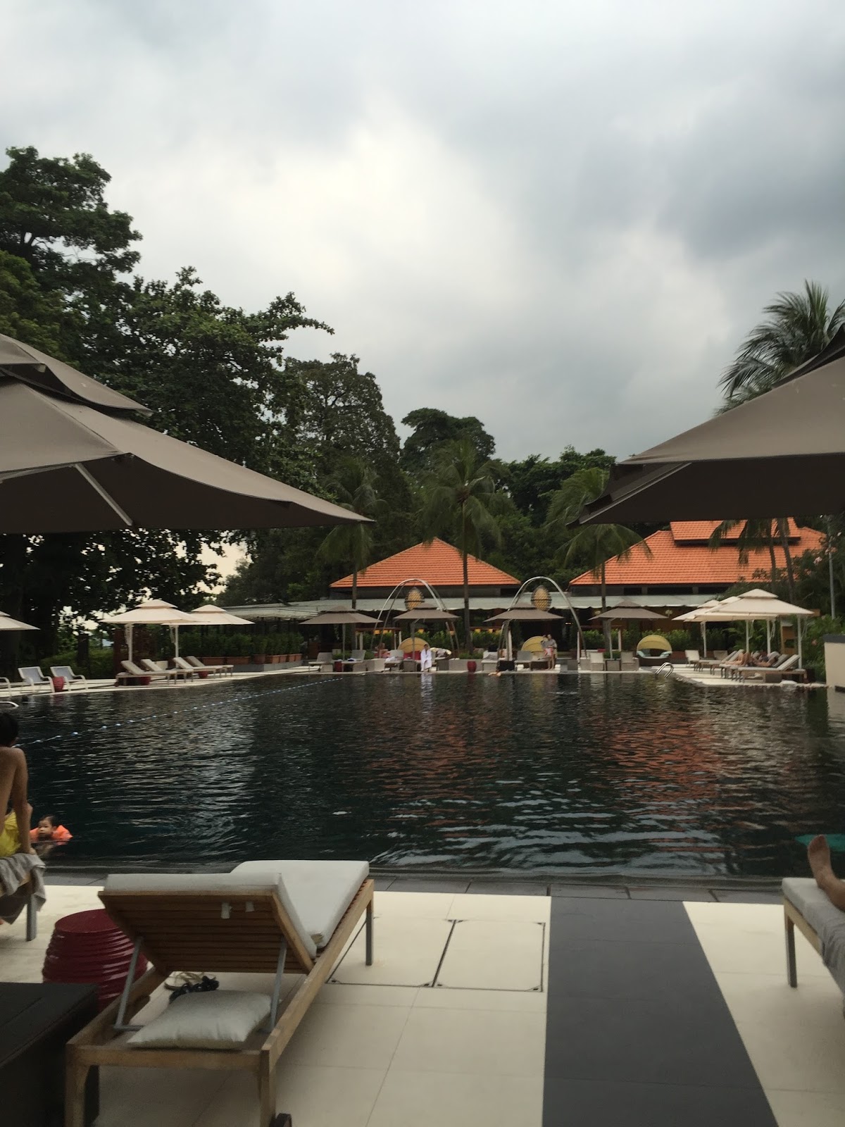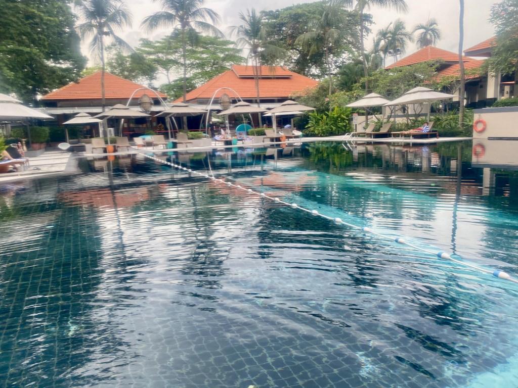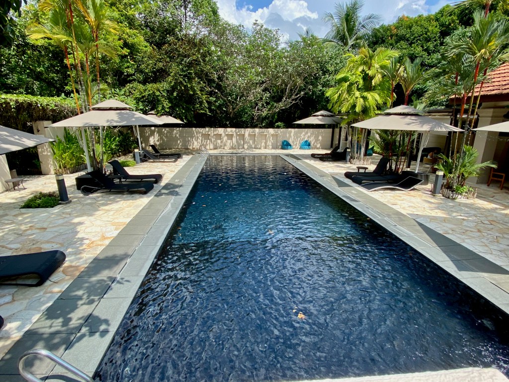 The resort has a large main pool just outside Kwee Zin. There is a large number of seating in the form of tanning chairs and cabanas surrounding the pool. The main pool is a great place for guests who want a good tan, as no vegetation is around to block the sun. The pool gets progressively deeper and has a 2.5m deep end. The main swimming pool is segregated into three sections. The resort barricaded the shallower ends for children to use because there is no kid’s pool. On top of the floating lane segregation, Sofitel Sentosa Resort & Spa also provides lifevests for kids and placed a lifeguard on duty during the main pool’s opening hours. Next to the kid’s play area, the resort cordoned off a lane for guests who wanted to get a swim workout. The rest of the pool towards the deeper end is free for anyone confident enough to use.