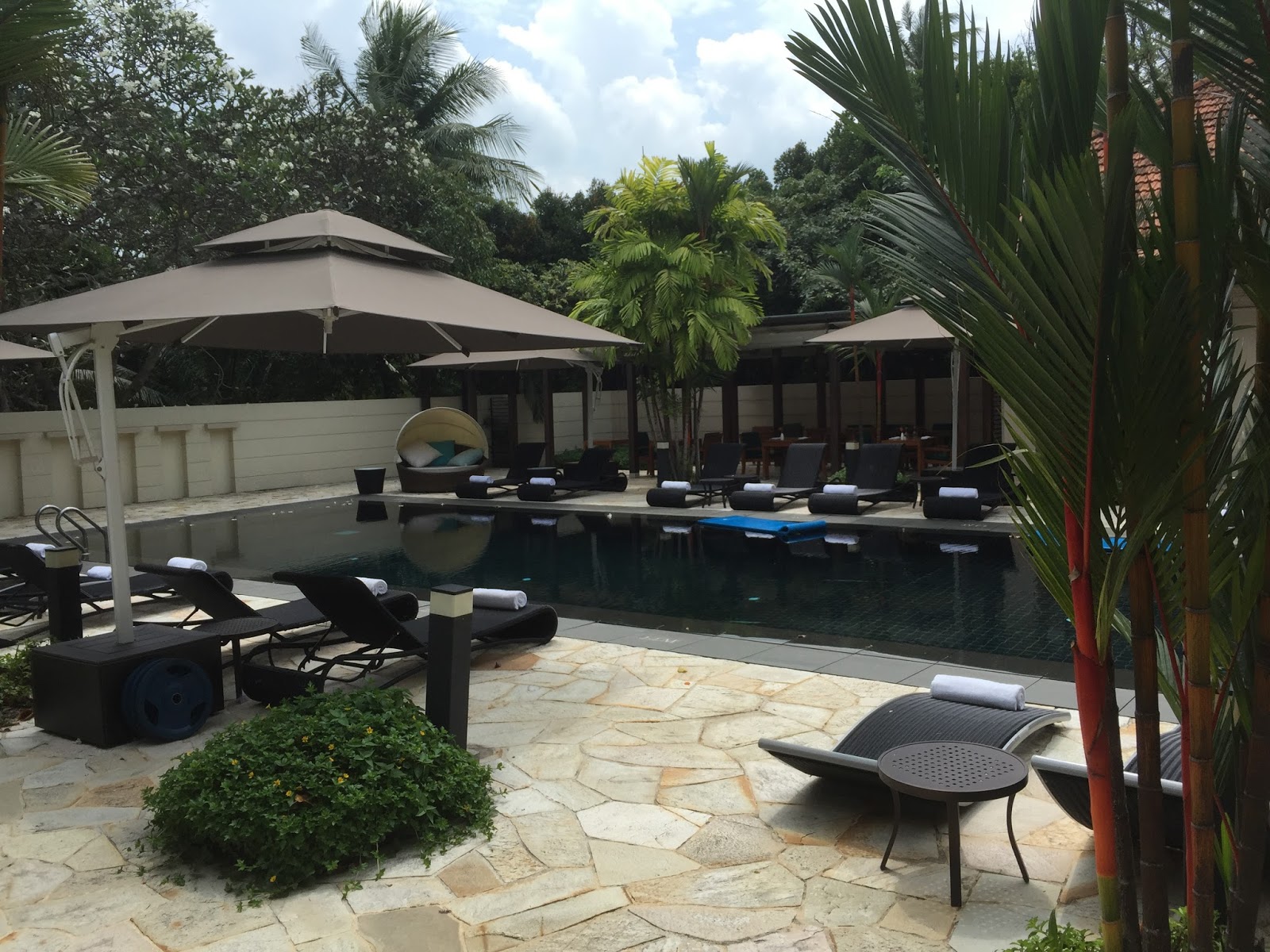 Our private pool mainly occupies the Villa du Jardin outdoor space at Sofitel Sentosa Resort & Spa. I thought this pool was sizeable enough for its occupants to do some decent laps, yet it was able to cater to family fun with children in the pool. The pool has a deeper middle section, but families with small kids can utilise the space near the end of the pool, which has steps and is shallower. I like how Sofitel Sentosa Resort & Spa furnished the outdoor space with furniture ranging from outdoor sofas and chairs to sun deck chairs, which is superb for us to enjoy the outdoor space. We like the pool area in Villa 4 as it does not have thick vegetation surrounding it, which meant we could sunbathe and not be bothered by the fallen leaves from the trees. I find the pool area in Villa 4 to be cleaner at any one time.