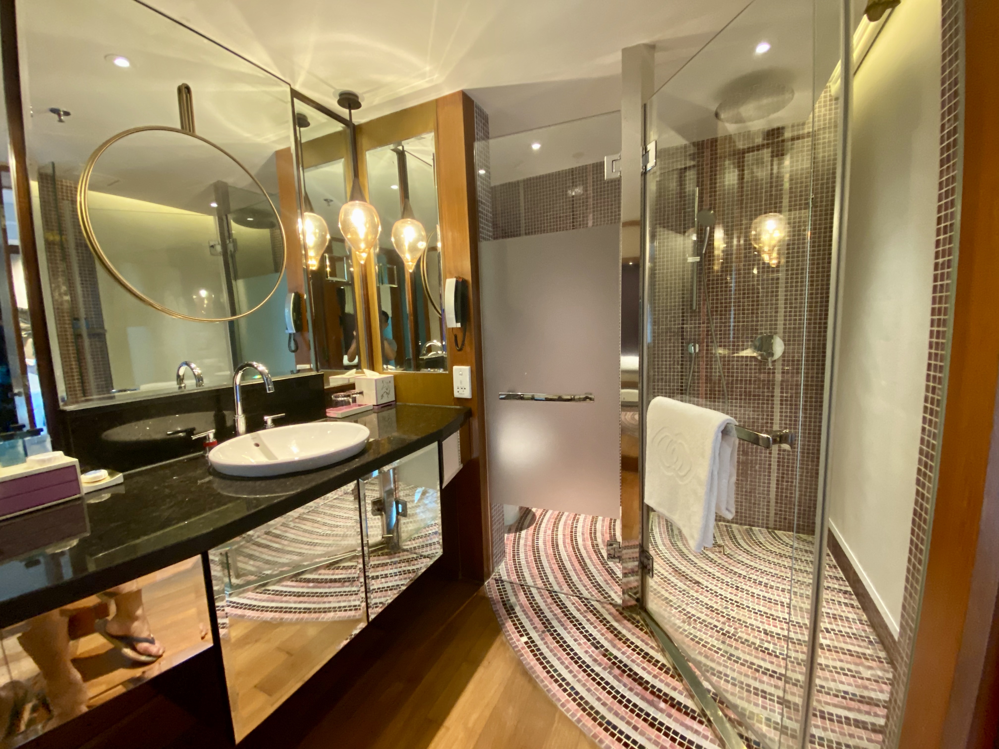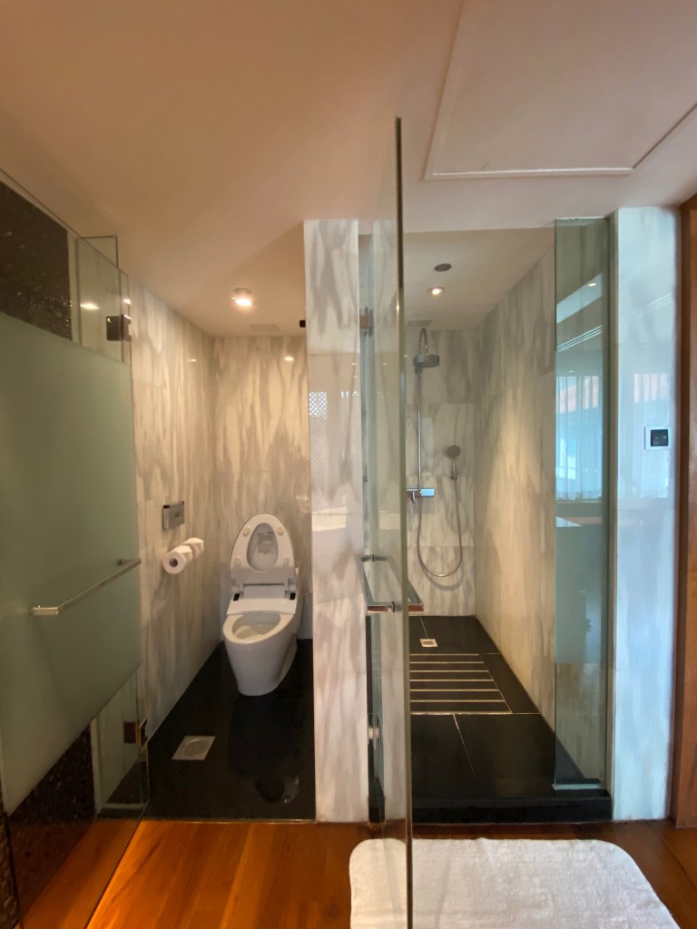 Passing through the sink and at the bathroom’s end is a bathtub sitting in a black marble fixture. Unlike the master bathroom, the bathtub fitted here does not have a jacuzzi function. Despite being fitted with a shower wand, we couldn’t find any switch that allowed us to switch from tap to shower wand mode. Cubicles stood guard on either side of the bathtub, between the tub and the sinks. The cubicle on the left has the toilet fitted behind a frost glass door, while the walk-in shower occupies the space on the right of the tub. The spacious walk-in shower is fitted with rain and regular shower heads. The lack of shelving for our toiletries in the walk-in shower did not bother us too much, as we were able to use the ledge at the window inside the walk-in shower to place our facial wash and dental kits.