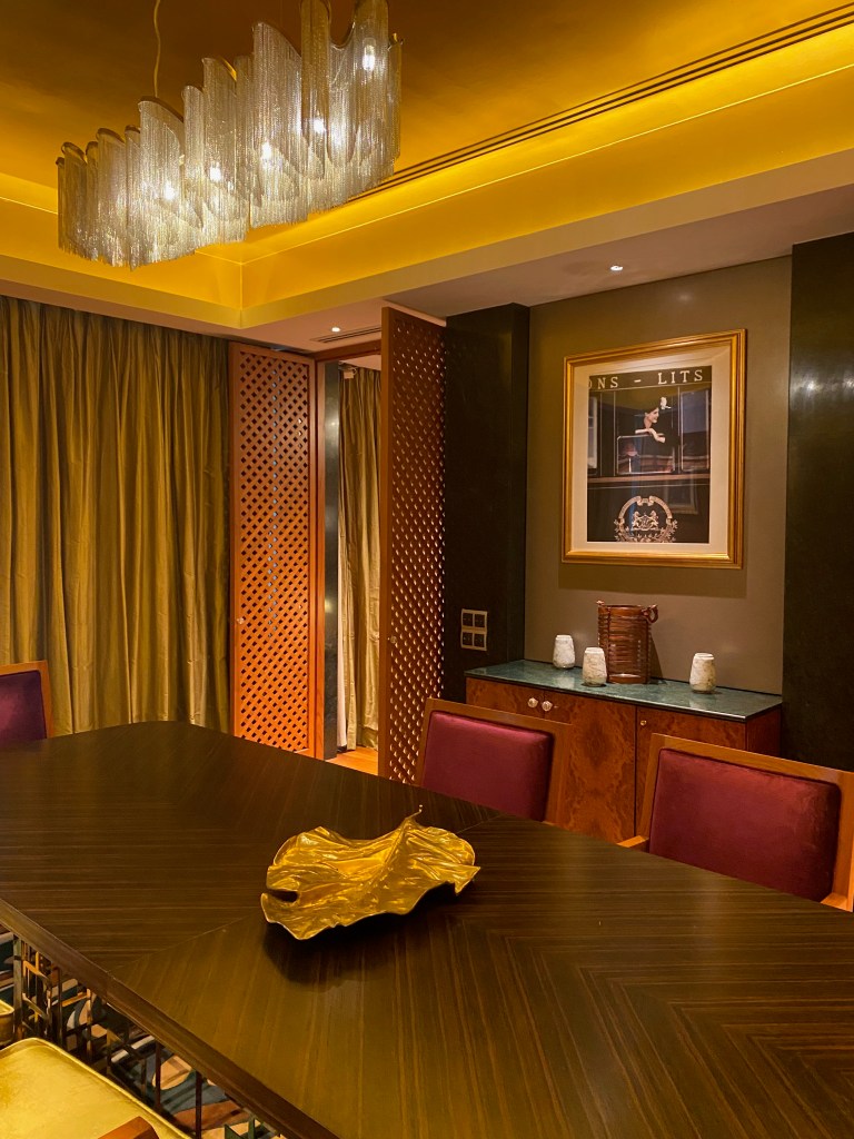 The main entrance of the villa opens up to the expansive living room. The use of red in the sofas and carpet to contrast the wooden flooring and ceiling and soft yellow wallpaper seems to invite us to sit on the fabric sofas. The chandelier hanging in the middle of the living room gave the villa a luxurious touch. The paintings of the Luxembourg Garden and simple art decor hanging on the living room walls, coupled with the metallic art pieces tastefully placed in parts of the living, gave it a French flair, paying homage to the origins of the Sofitel branding. The spaciousness of the living room space is enhanced by the high ceiling and the panel of floor-to-ceiling glass doors that look out into the pool area. These glass doors can be fully opened to create an inside-outside living concept, inviting the outdoors into the living room. The living room space has a distinct lounge, dining, and small pantry.