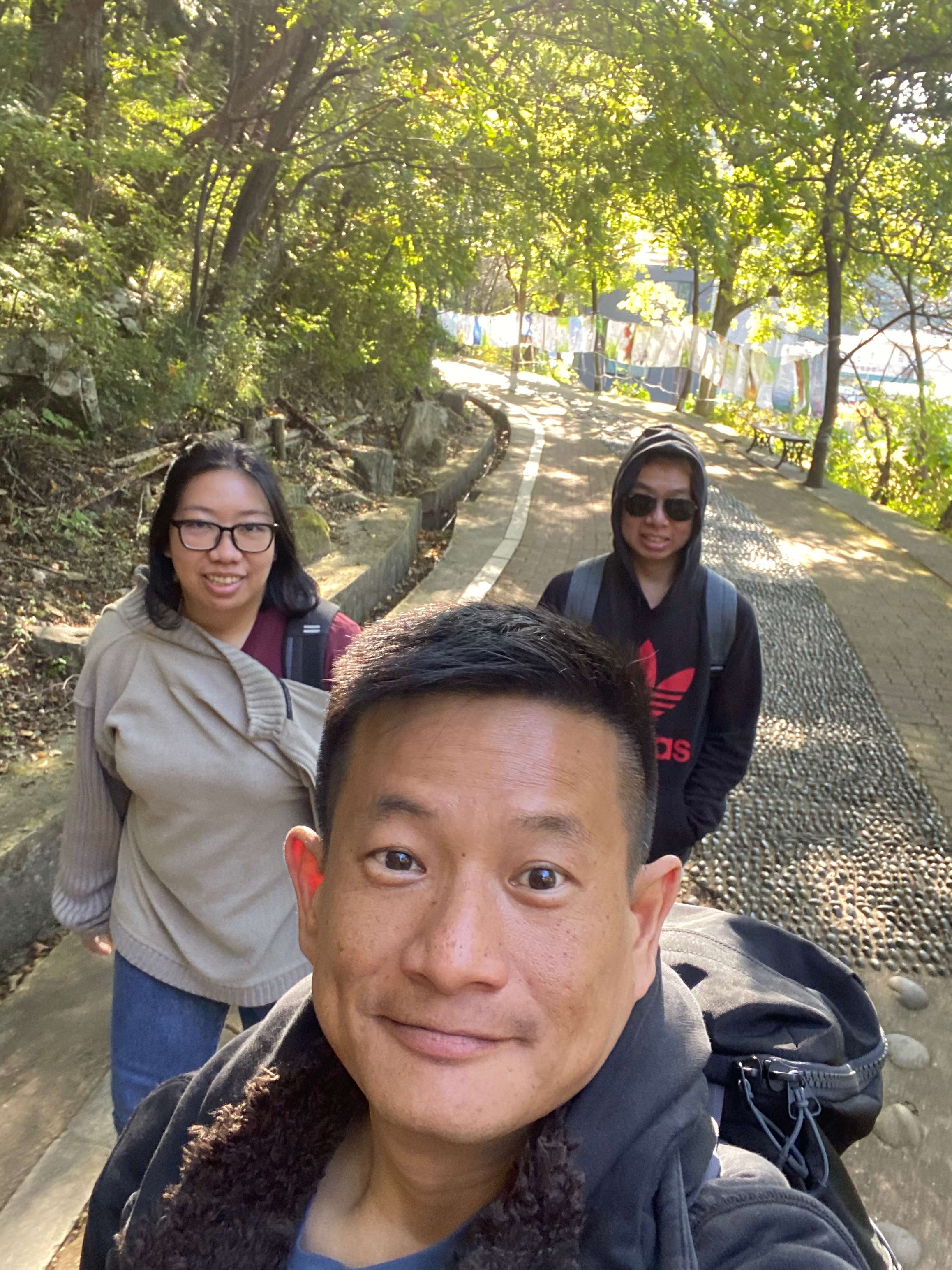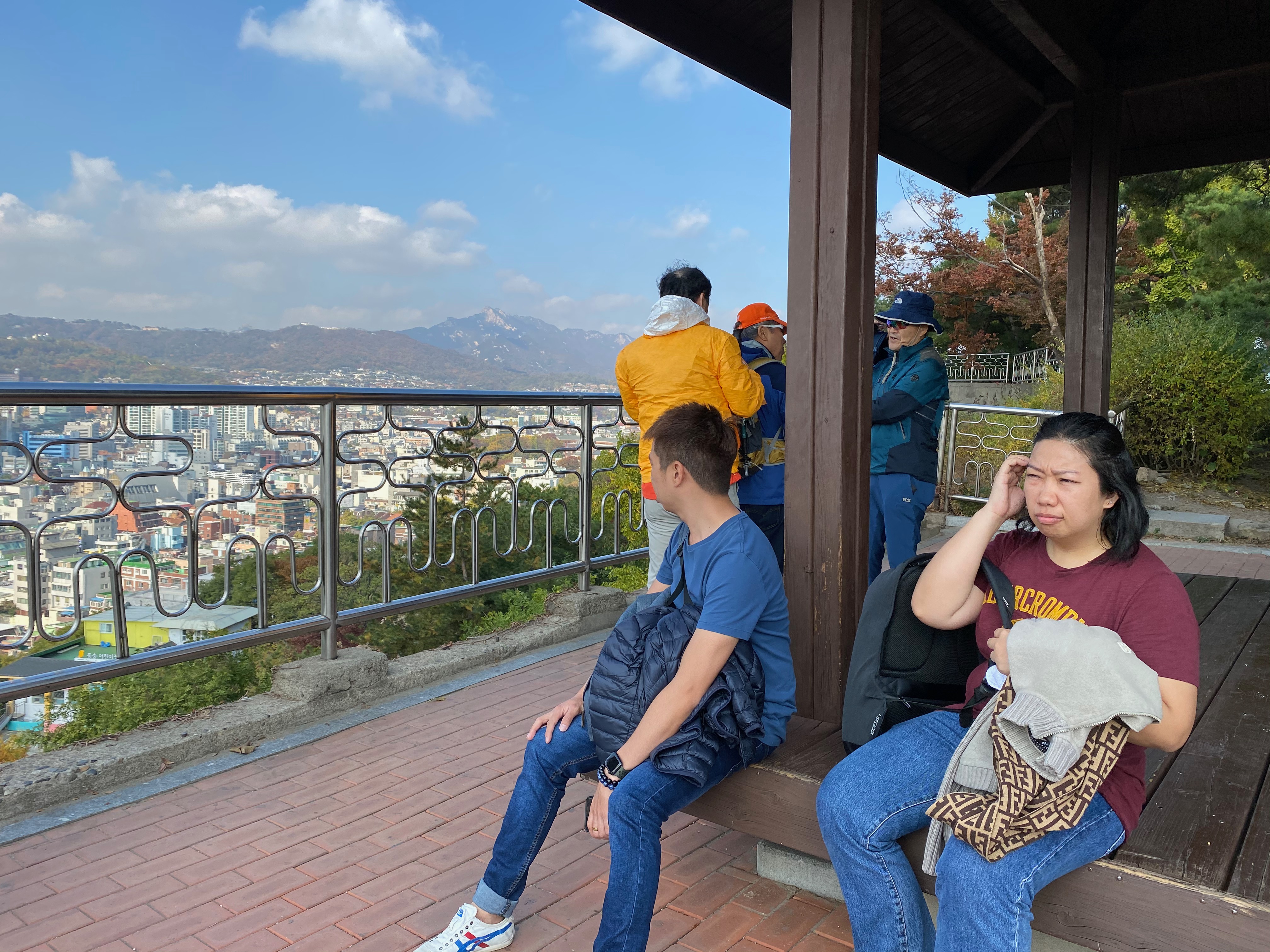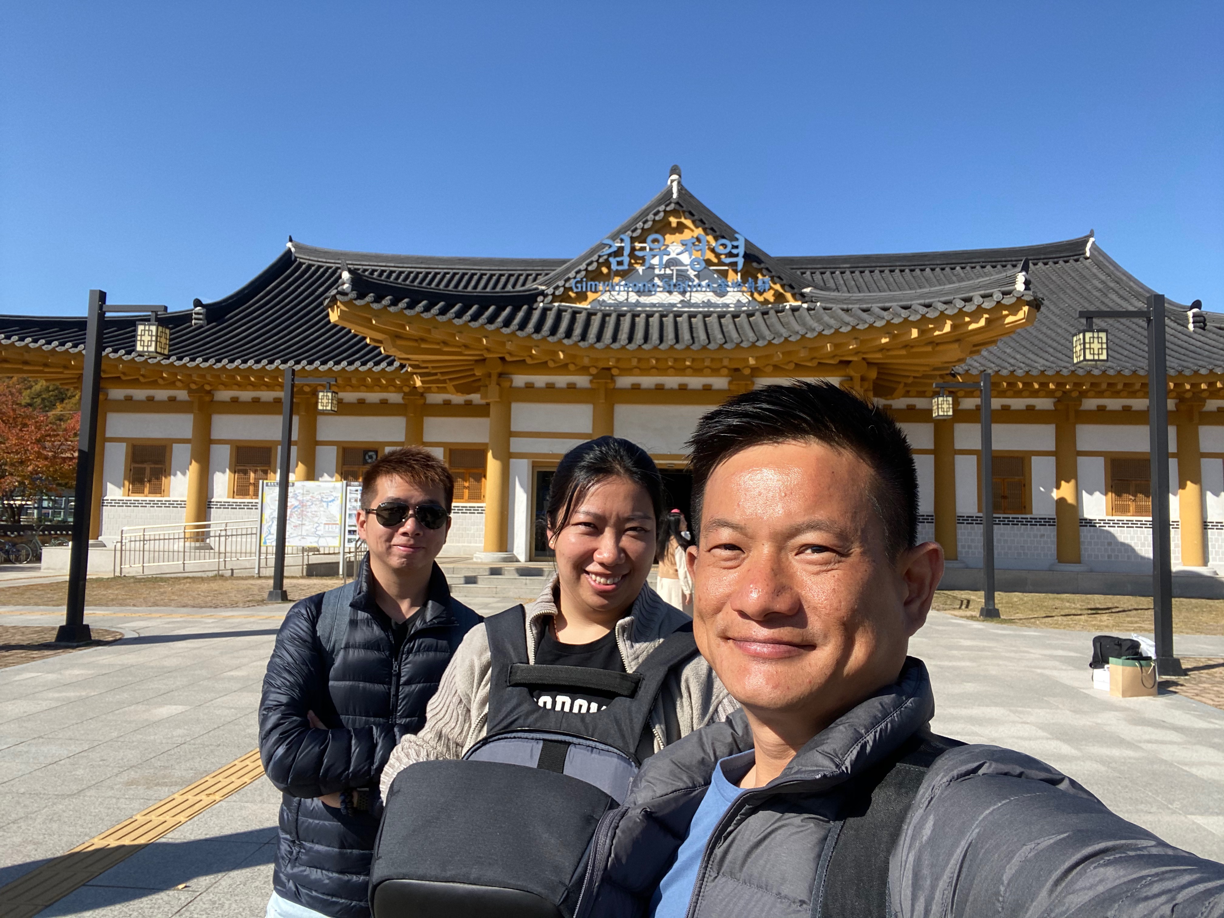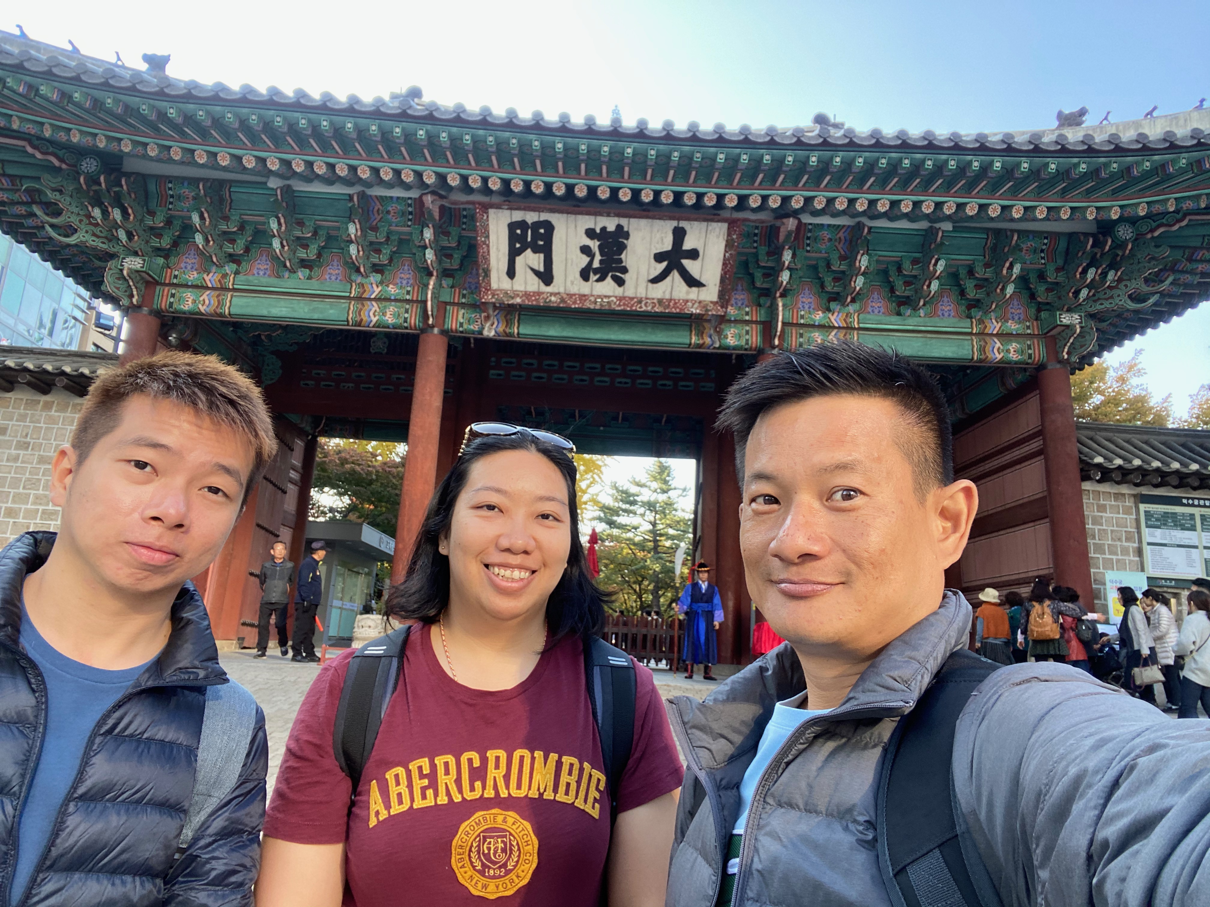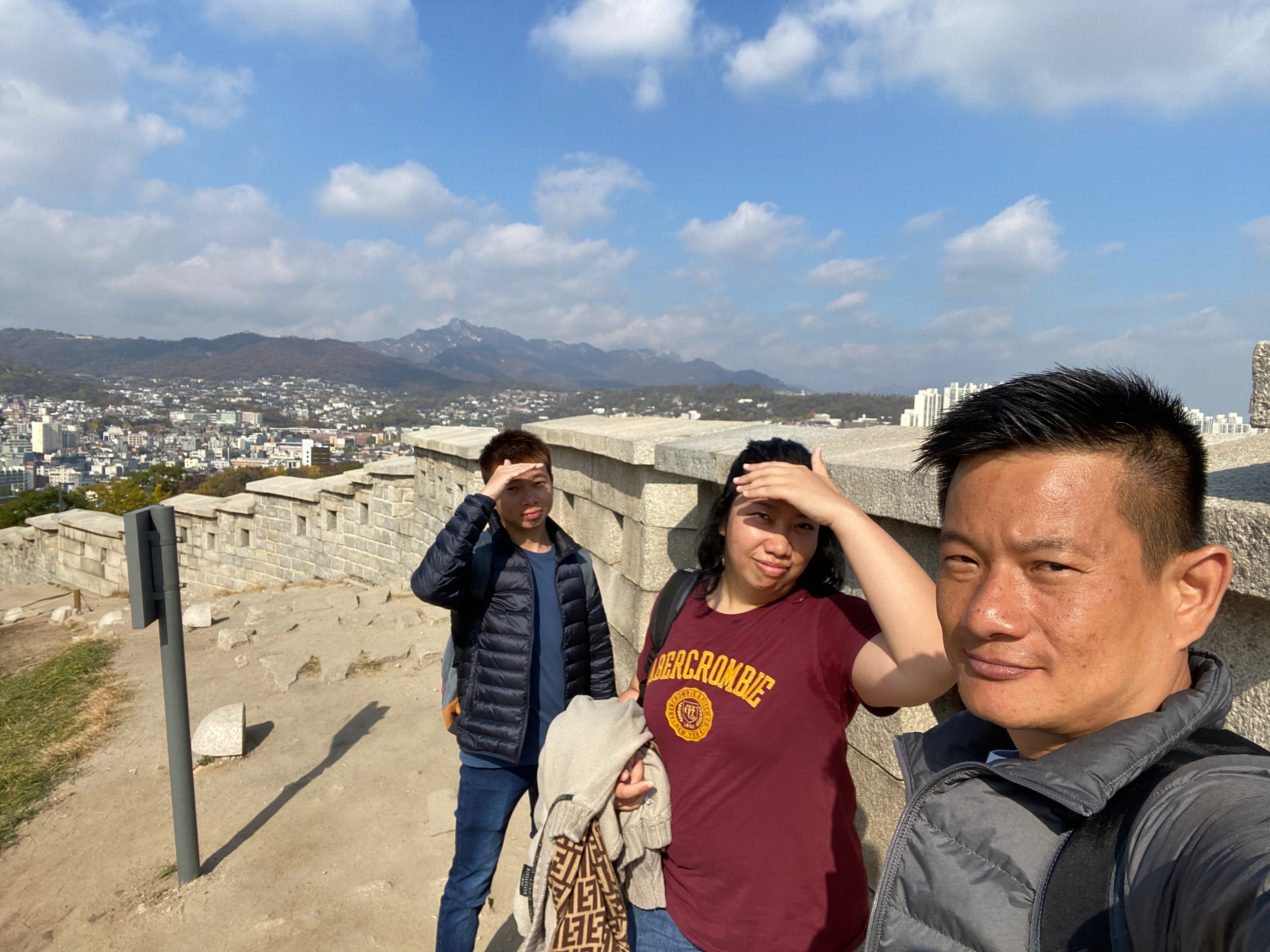 Taking a wefie in the pavilion with Hwaseomun in the background