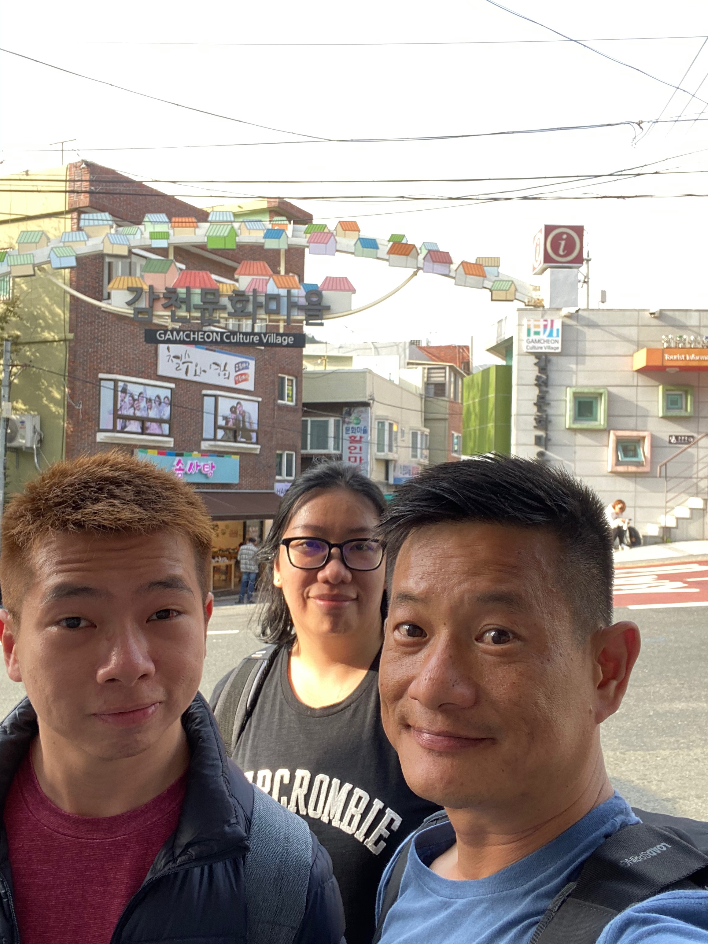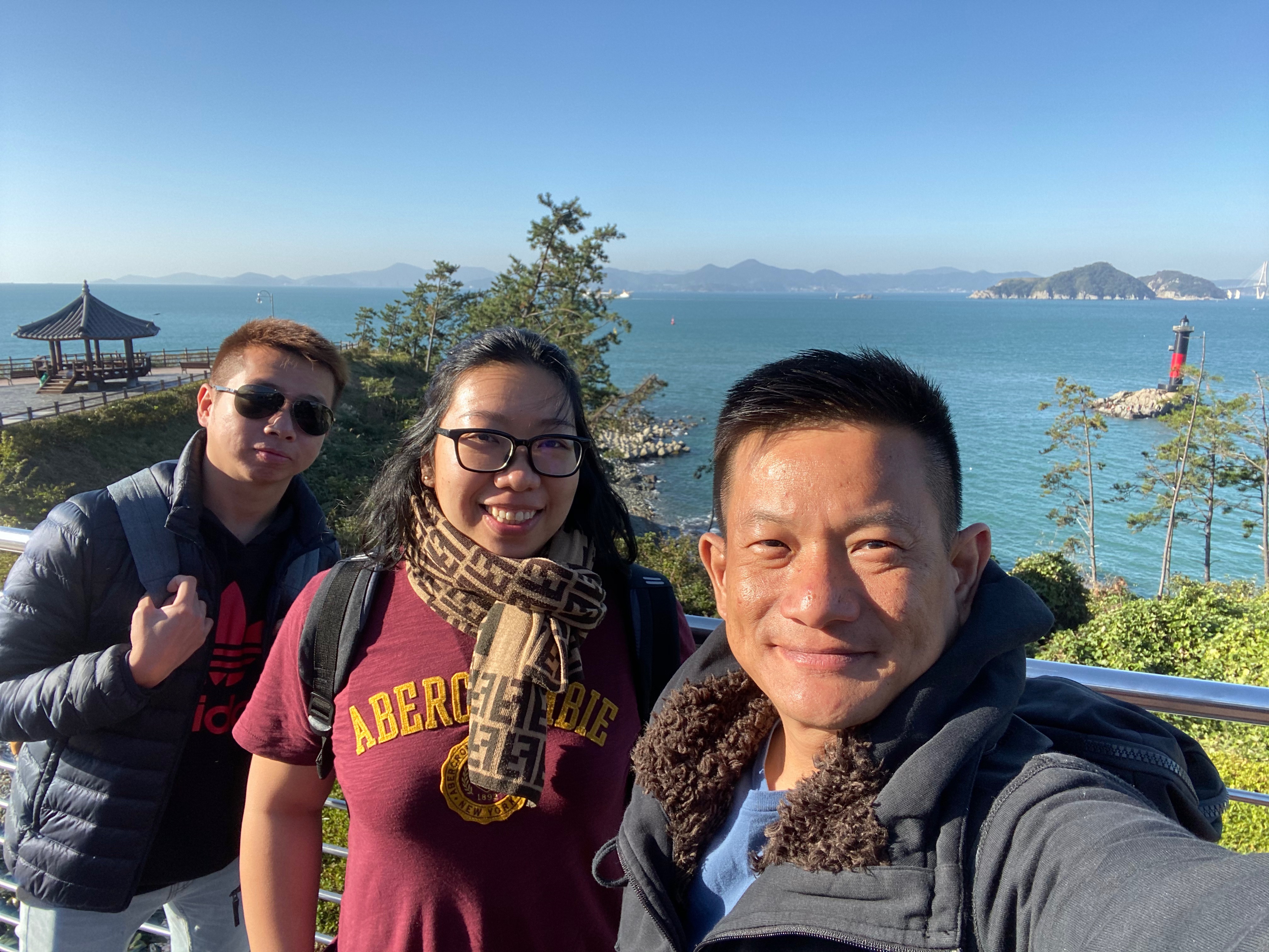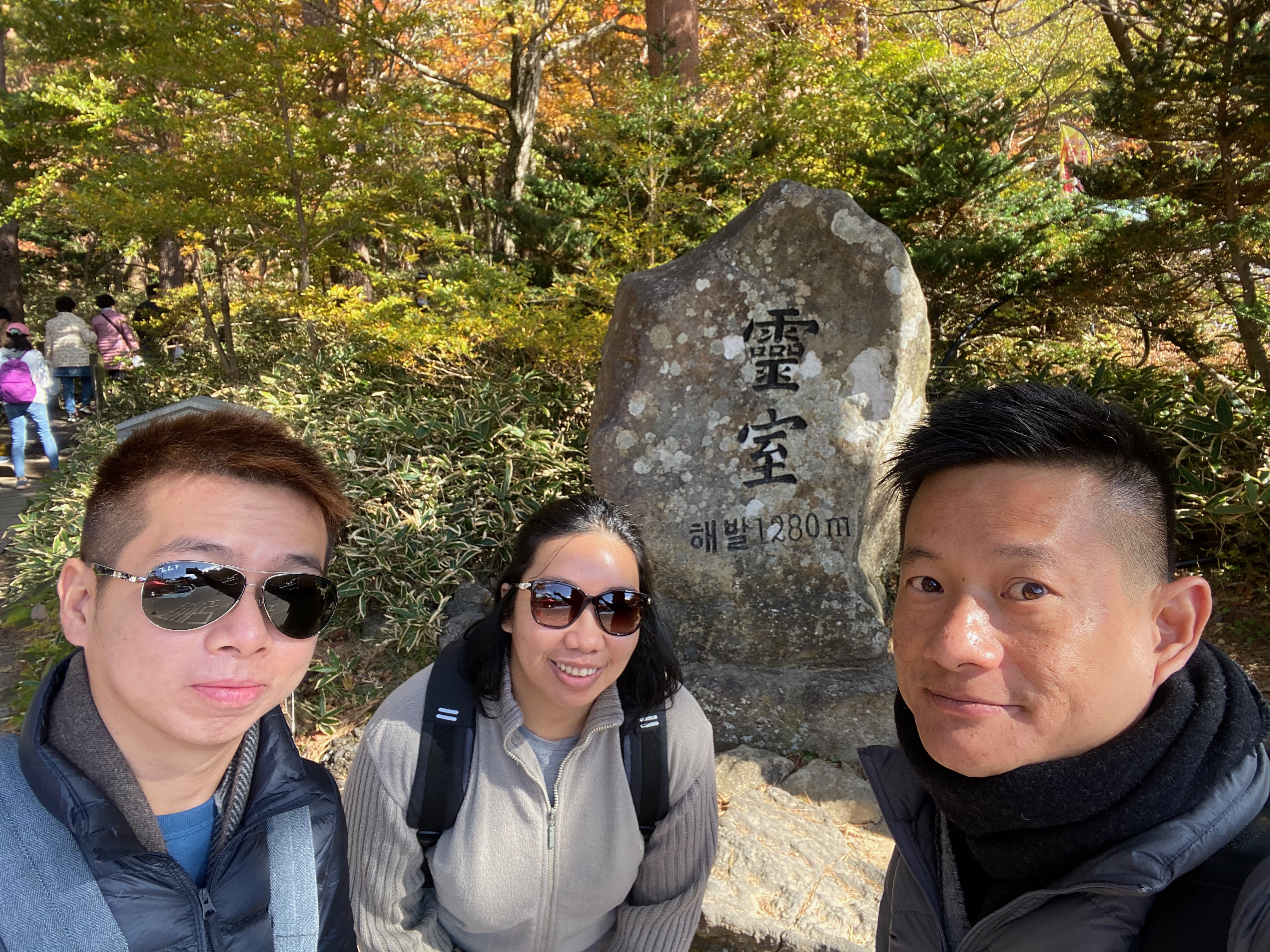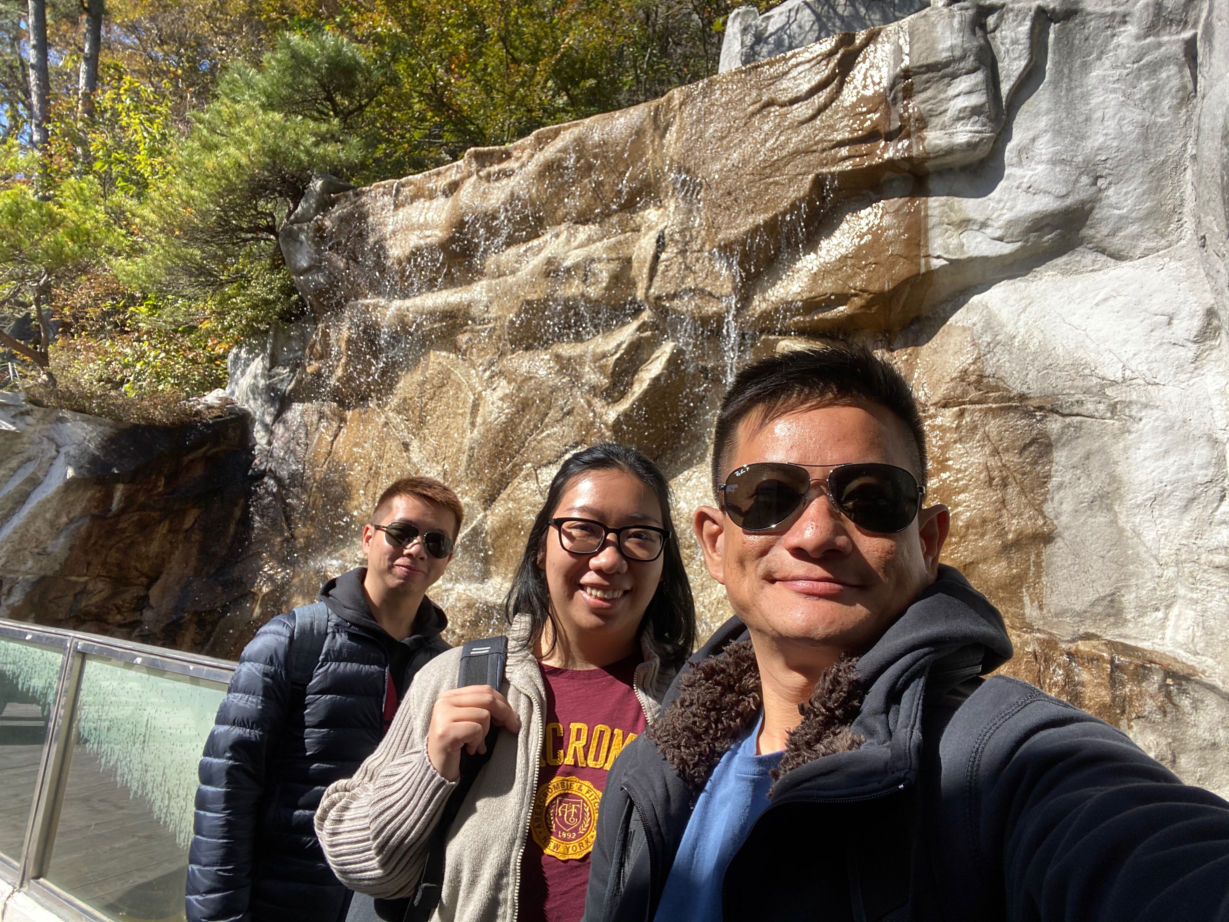Taking a wefie in the pavilion with Hwaseomun in the background