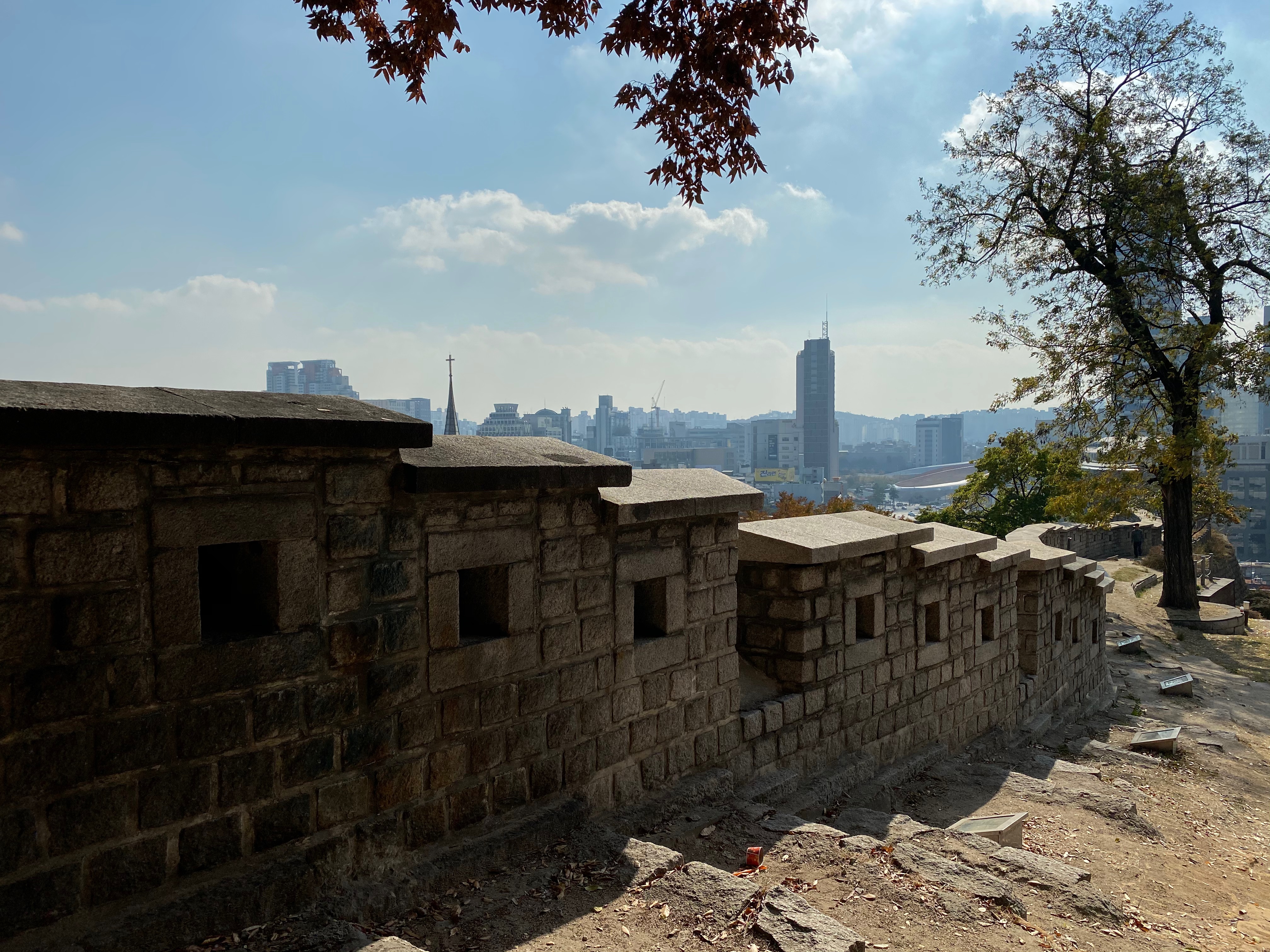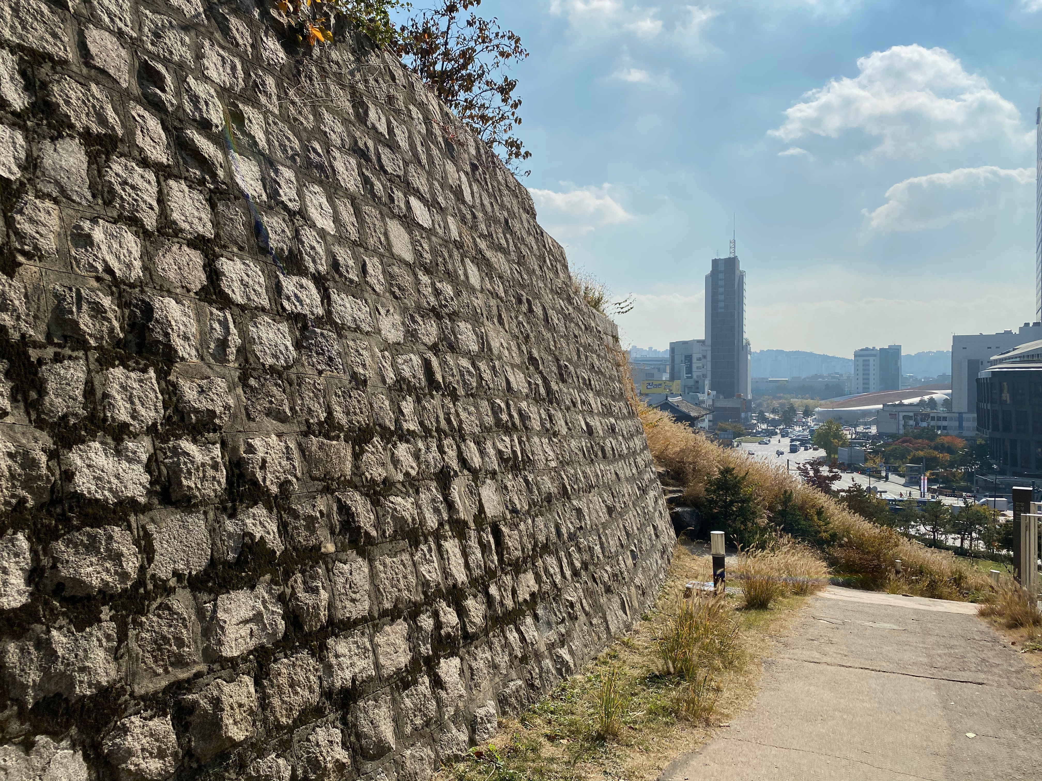 From Dongjangdae, we could see our endpoint, Changnyongmun, across the road. I told my friends that seeing Dongjangdae is an indication that our walk along Hwaseong Fortress is coming to an end and pointed to our endpoint across the road. We skirted around Dongjangdae and resumed our stroll along the wall. The next structure we came across along Hwaseong Fortress is a three-storey circular-shaped watchtower. The watchtower is rather plain with no patterns or designs engraved onto any part of the tower. It was also closed at the time we arrived it. My friends and I took some pictures and left the watchtower. Not far from the watchtower (about 2 mins walk), we reached the crossbow platform. The lighting here is not as great as some parts of the wall, making the crossbow platform a tad difficult to visit. There is an opening to allow visitors to access the crossbow platform, however, due to the poor lighting, we merely took some quick pictures of the structure.Â