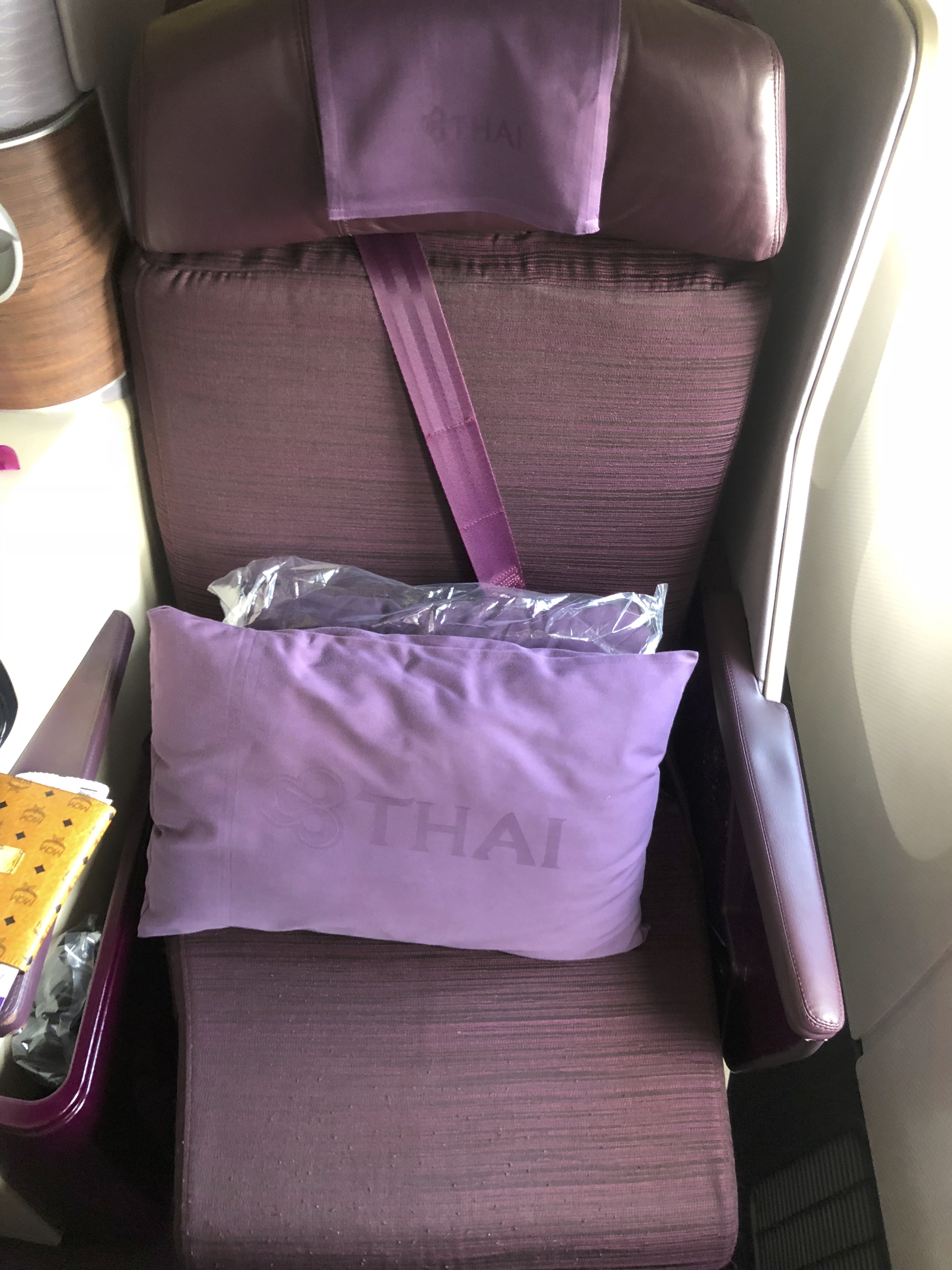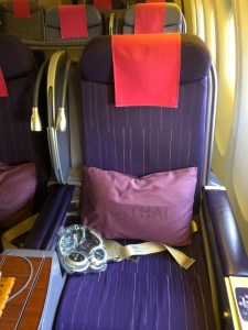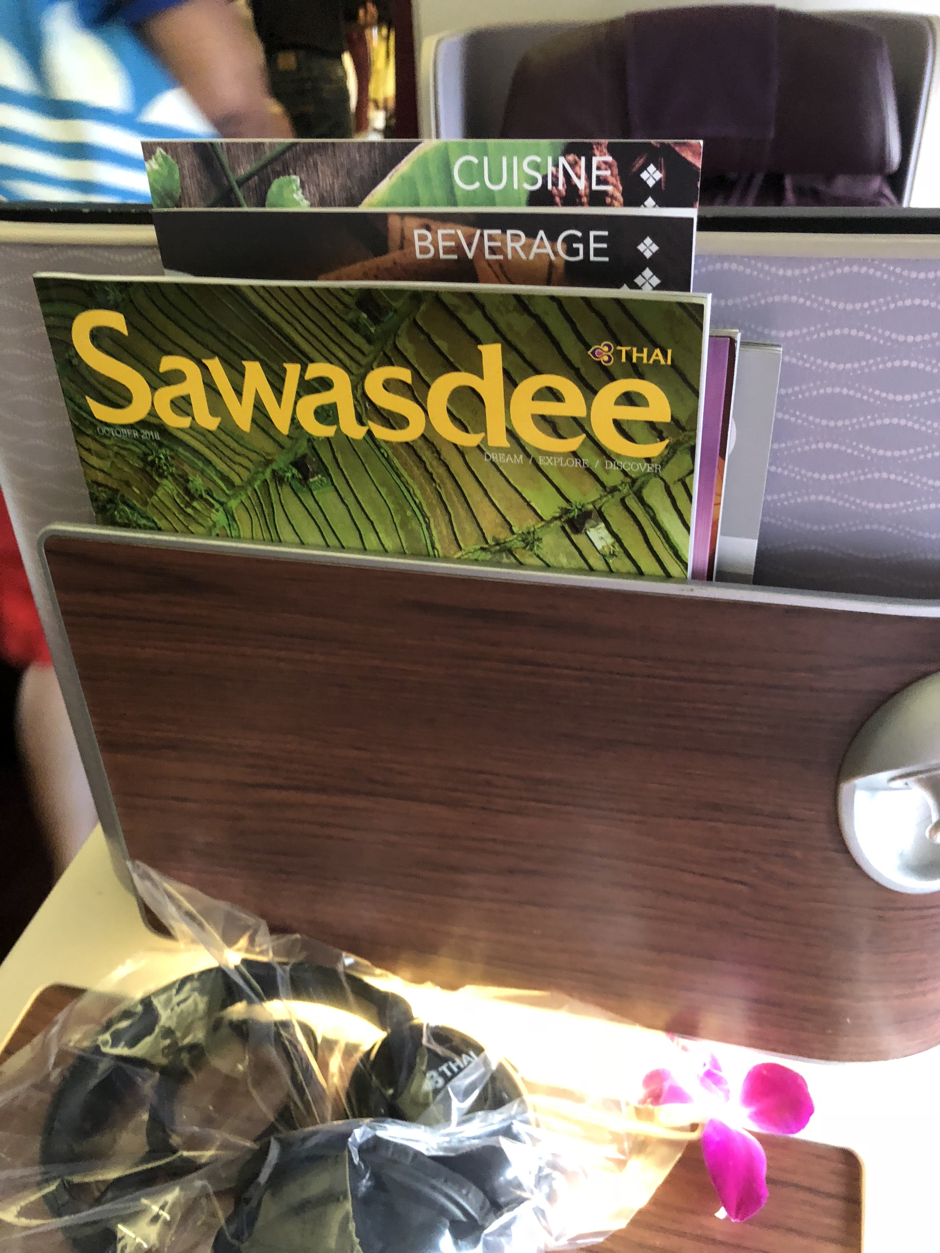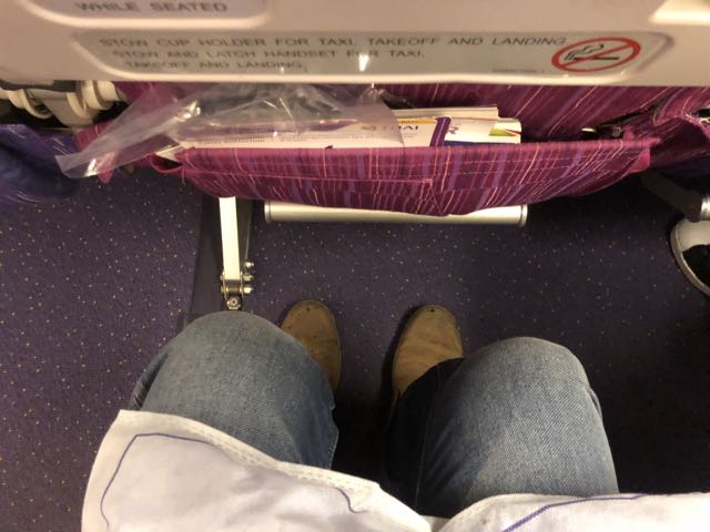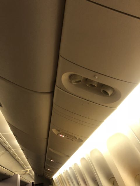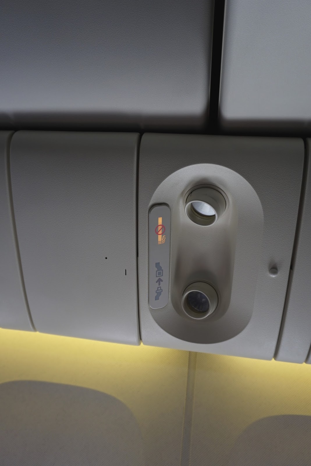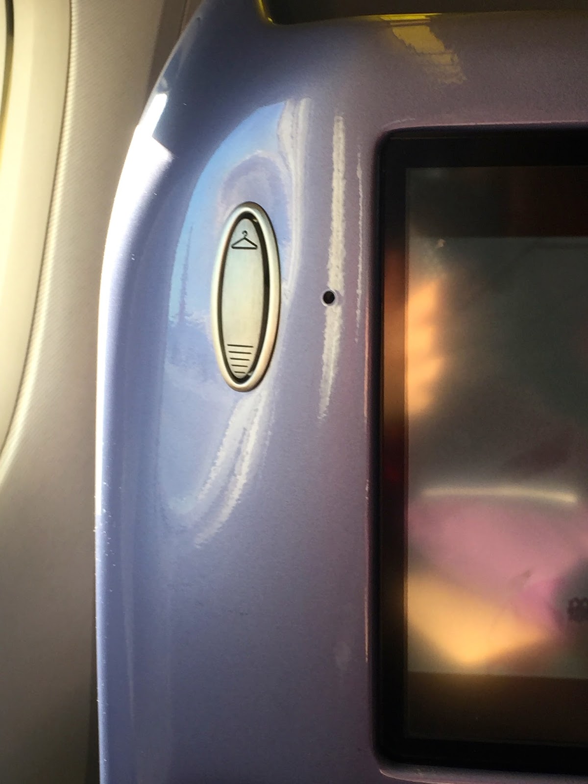 The tray table in the Economy Class cabin onboard Thai Airways A330-300 is rather large. The single fold tray table is able to hold the meal tray with space available to put a can of drink and the cup without cramping the entire tray table. I tend to find the tray tables, especially those that have bi-fold functions, on the newer aircraft to be a little tight on space as compared to the one on board the Thai Airways A330-300. Coat hooks are available in the Economy Class seats, which are located on the side of the seat in front of me. The placement of these hooks is a little odd as I cannot think of a way of hooking coats without disturbing the passenger in front of me. As in the Economy Class cabins onboard all other airlines, the reading light is located on the ceiling above the seat. However, there are no air vents on the ceiling. When boarding, pillows and headphones are placed in the seat, blankets can be requested from the flight attendants who are very happy to bring me one when requested for.