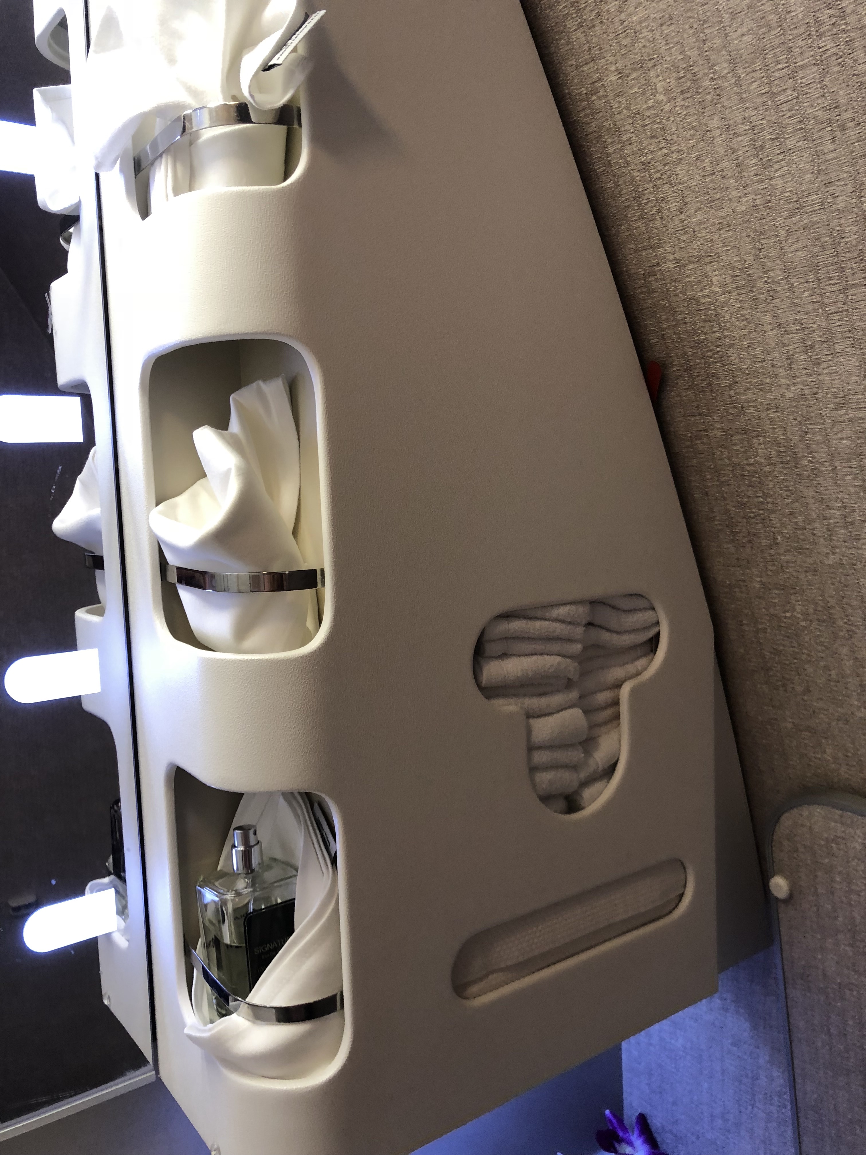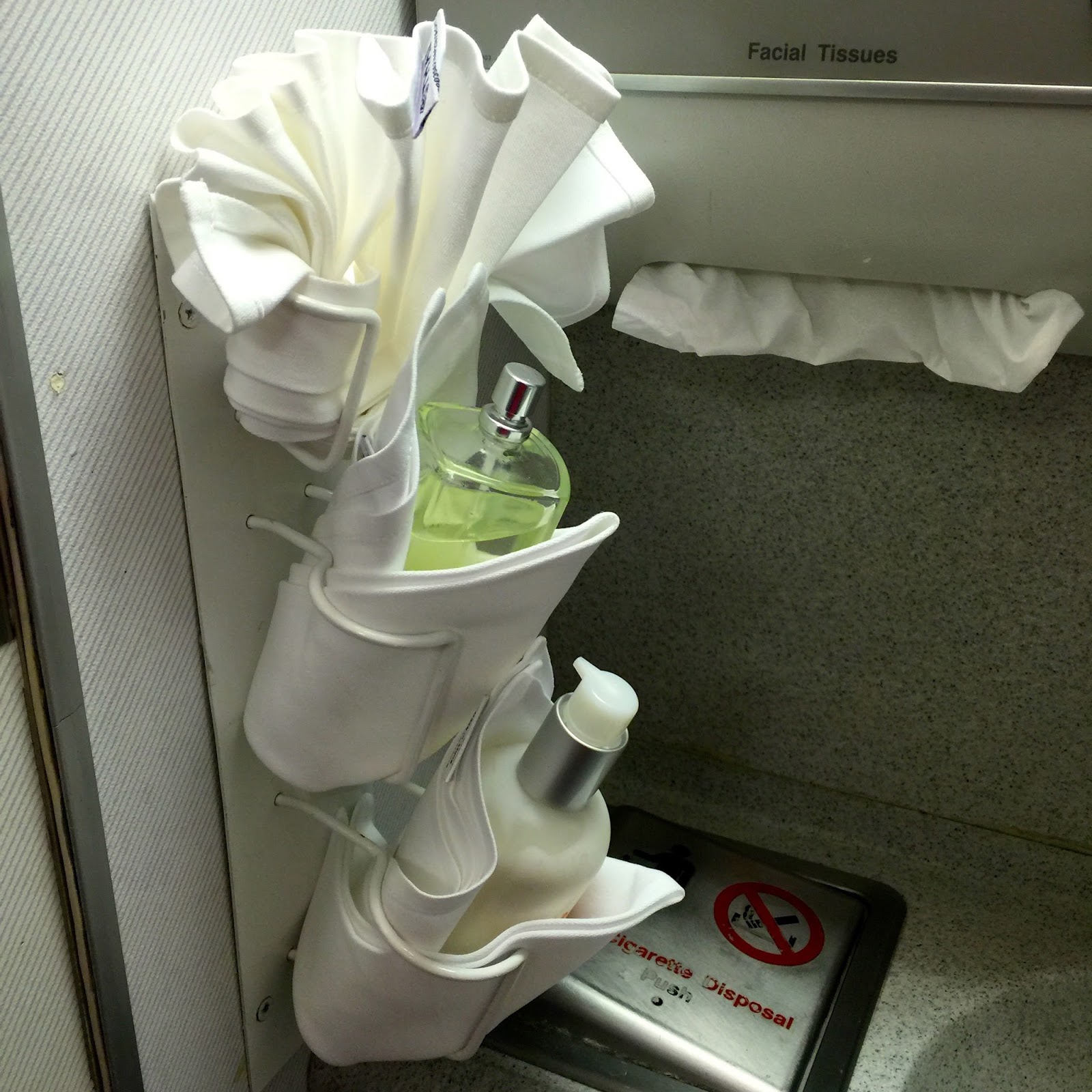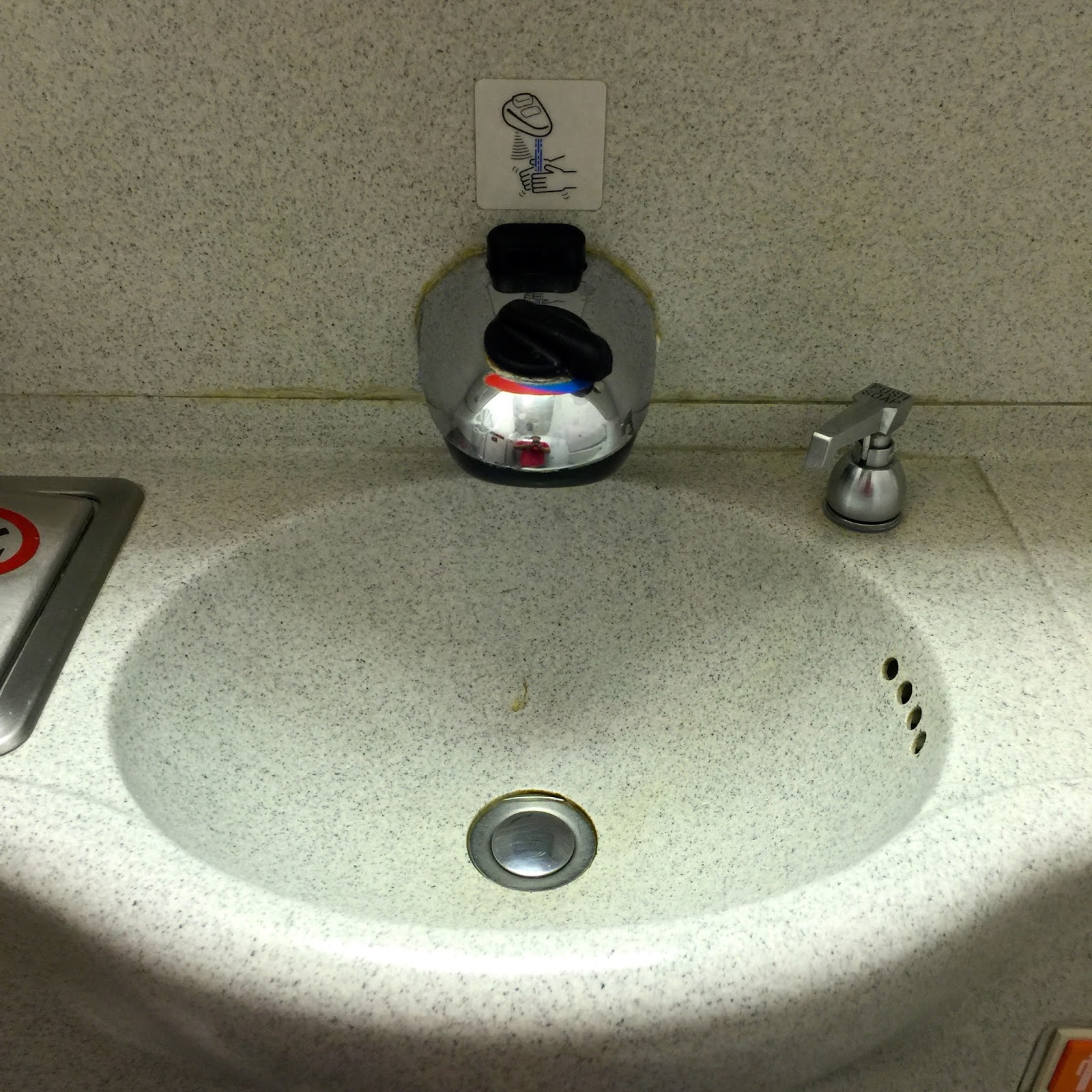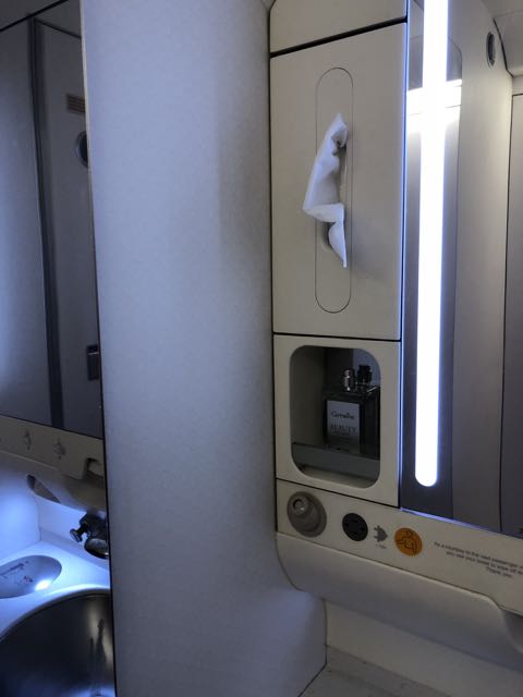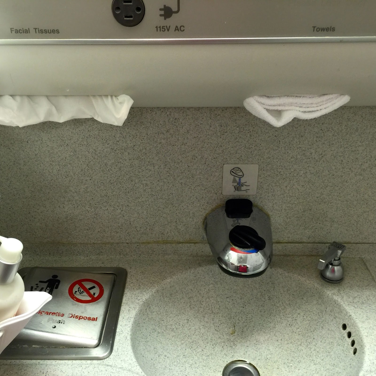 - Hand soap and cologne are the only amenities in the lavatory at the sink