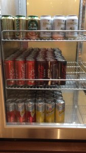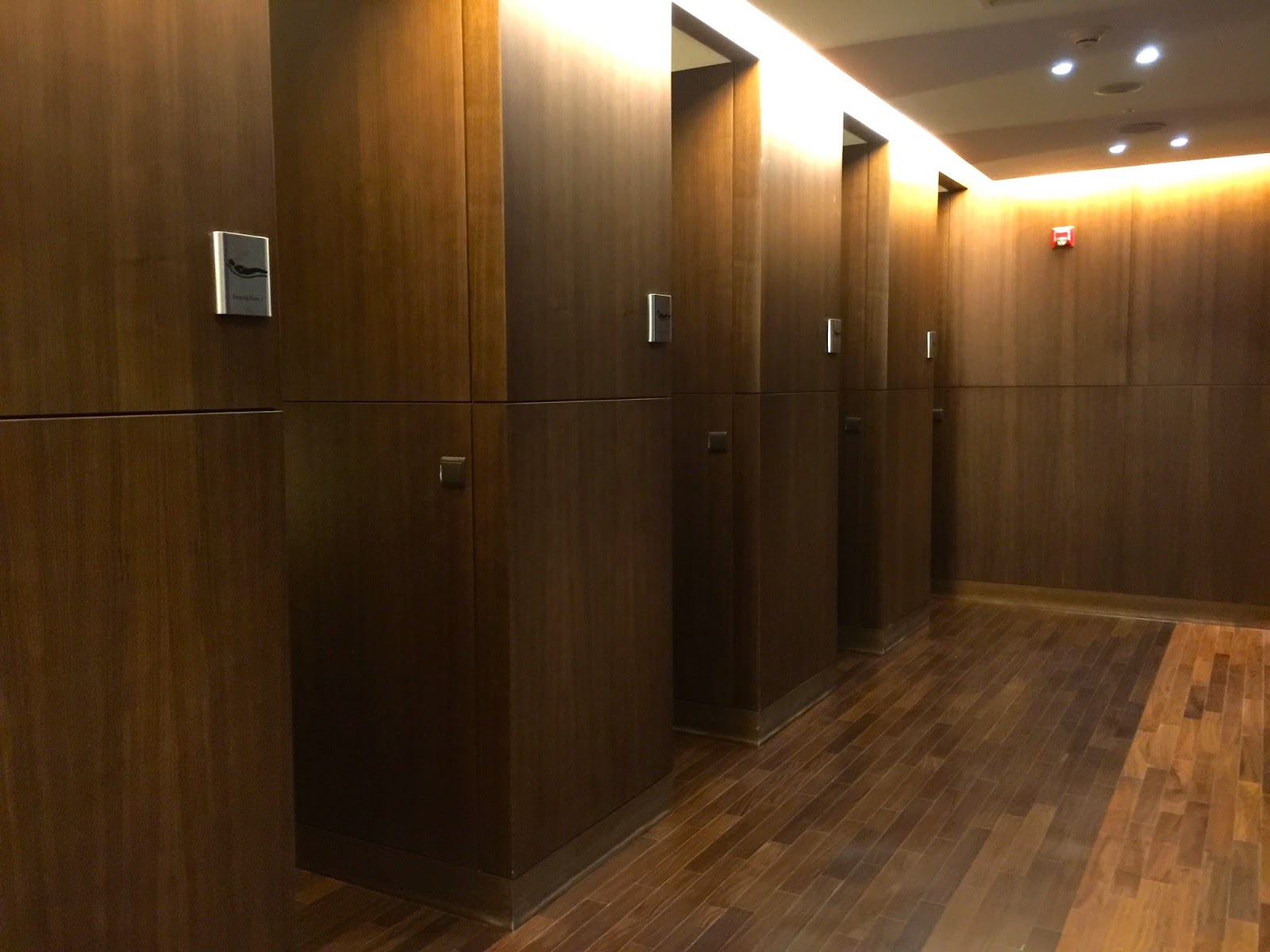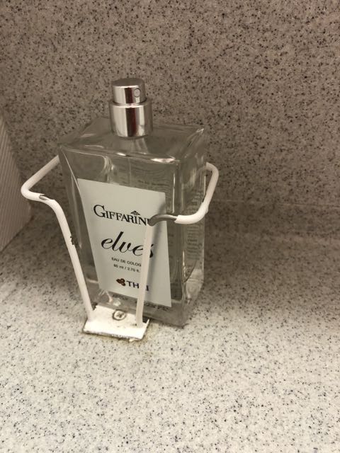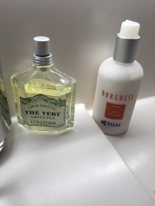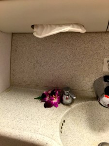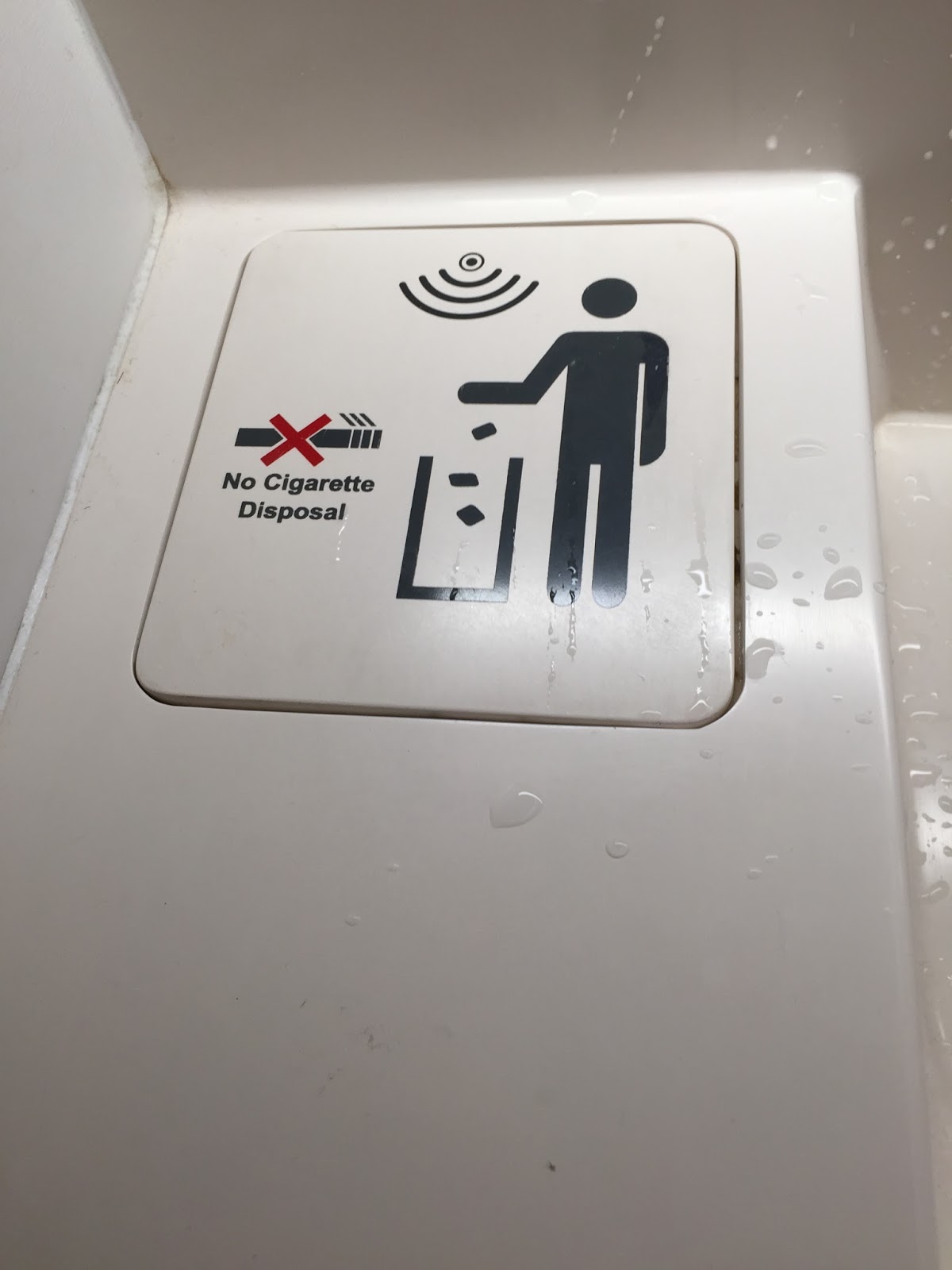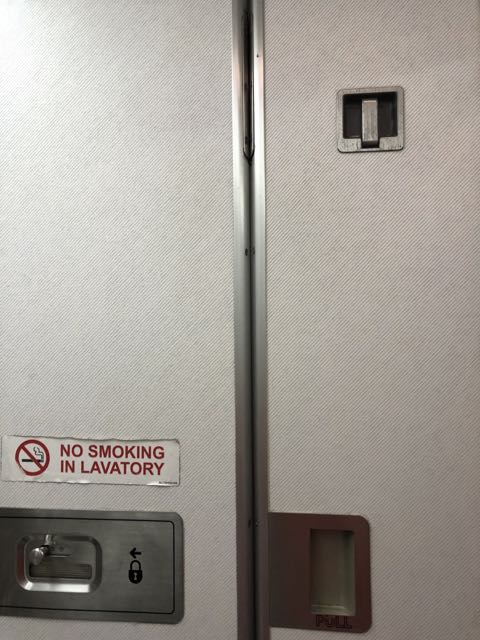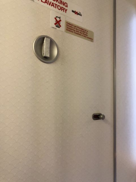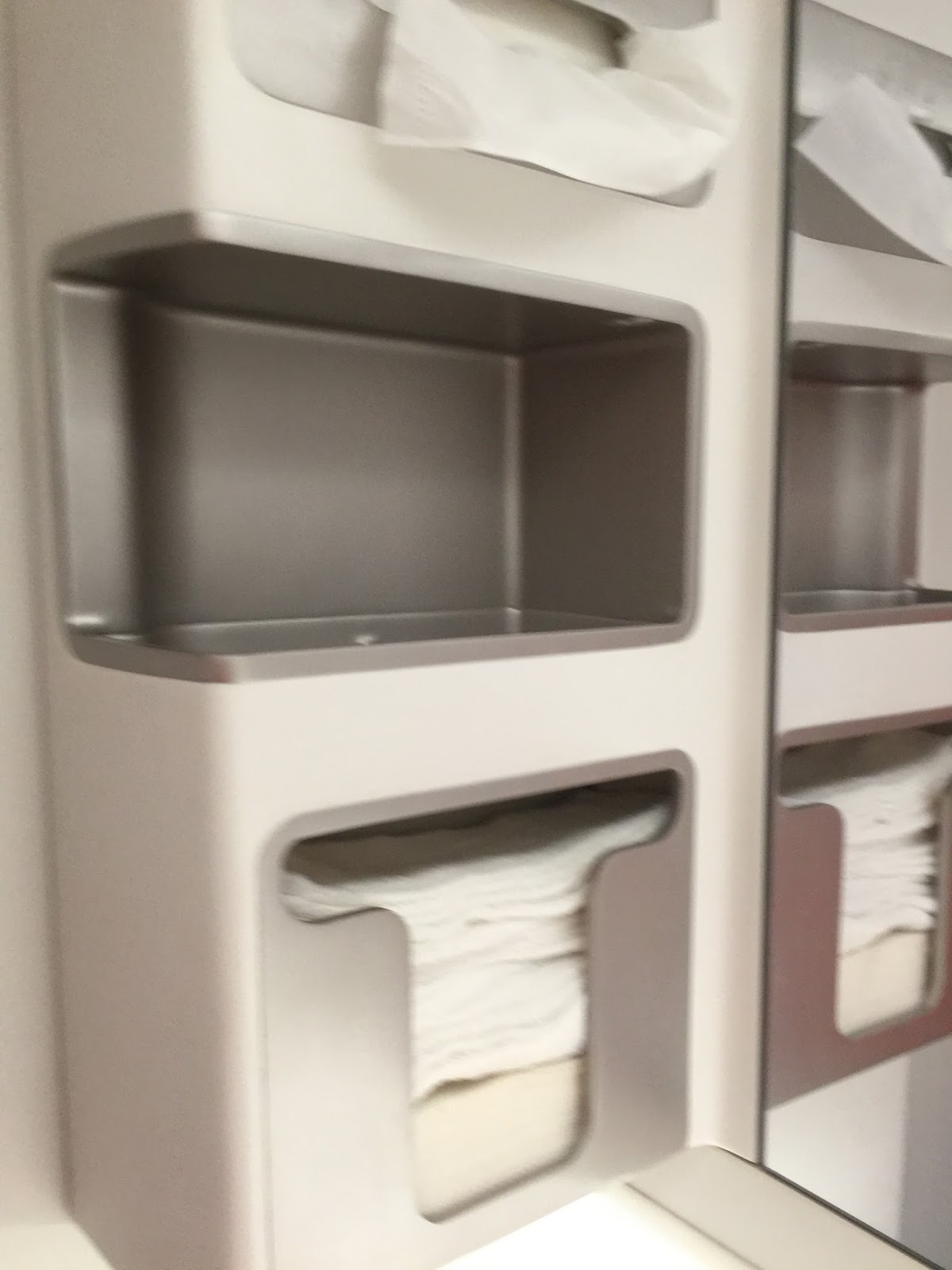 - Hand soap and cologne are the only amenities in the lavatory at the sink