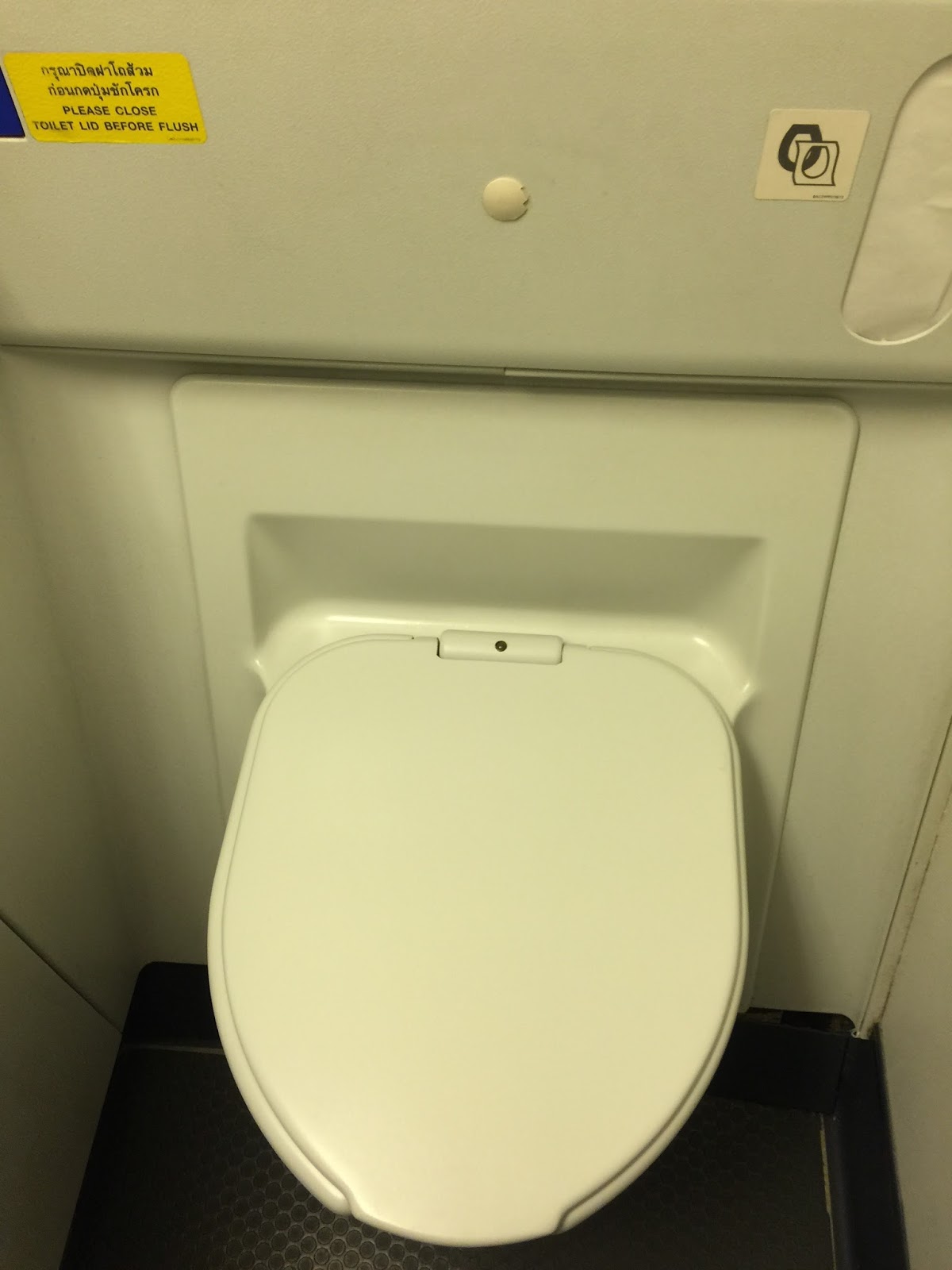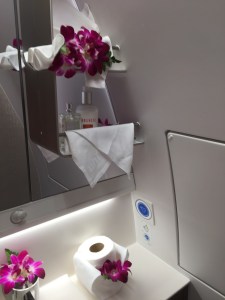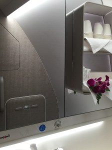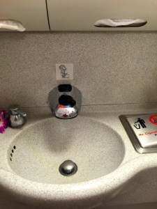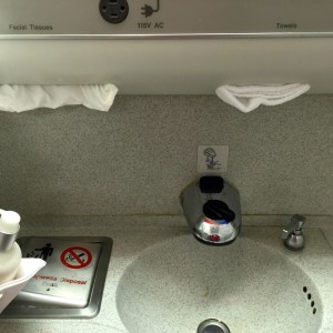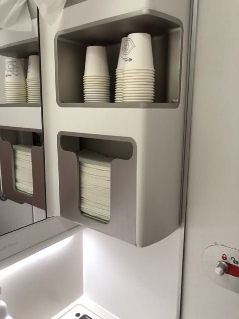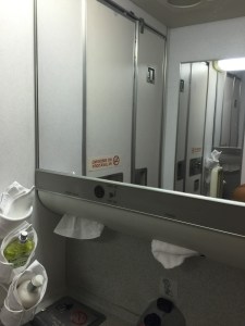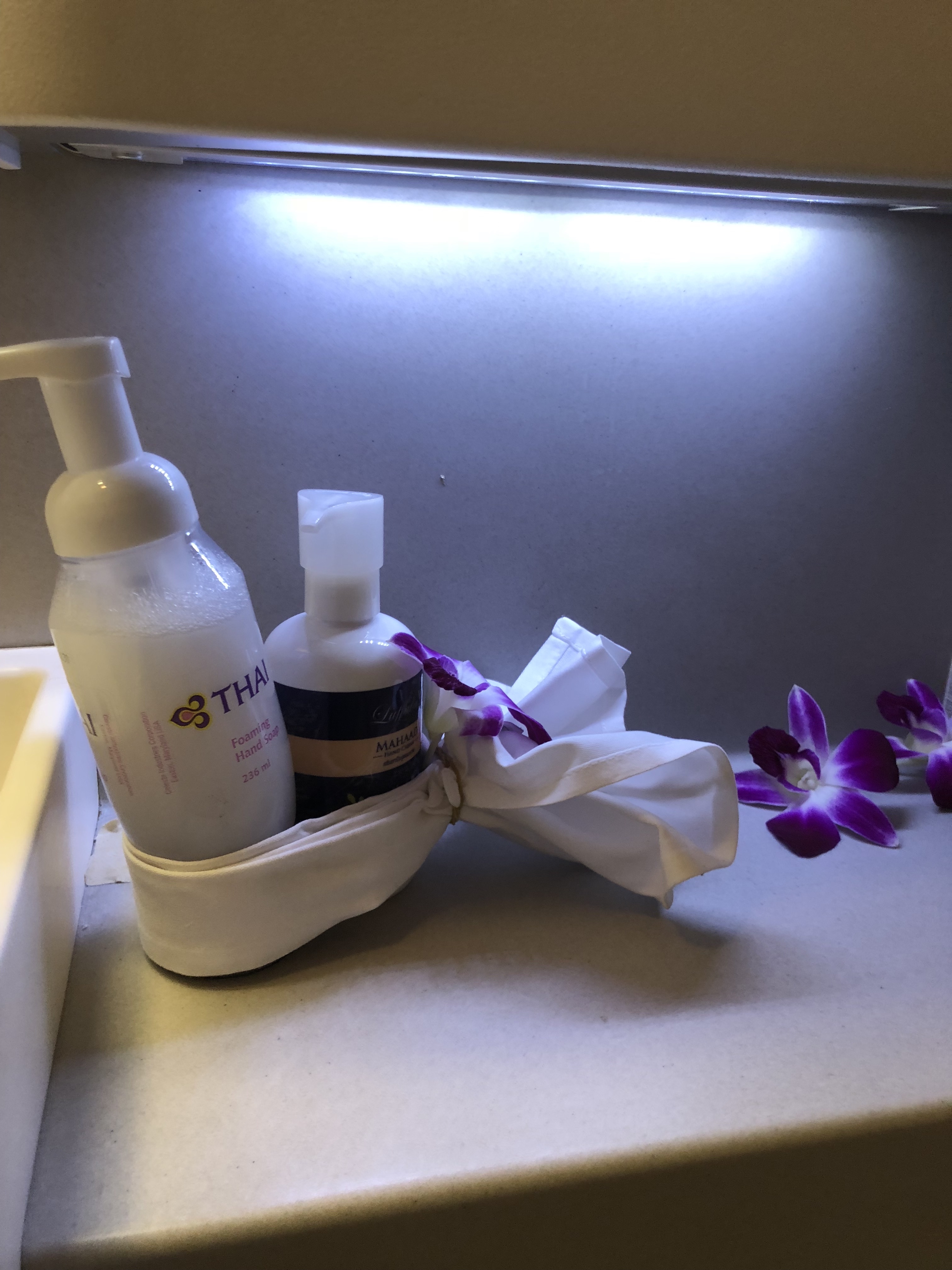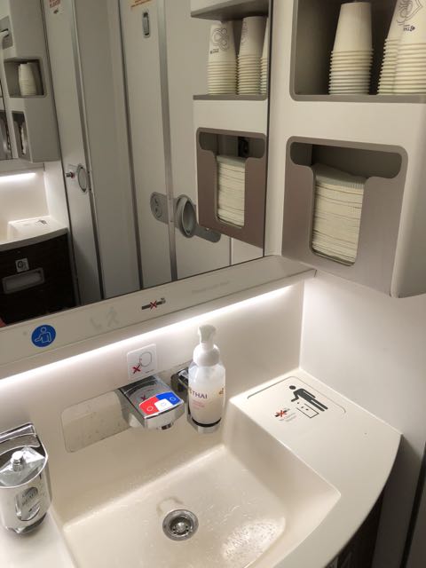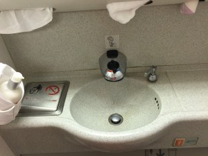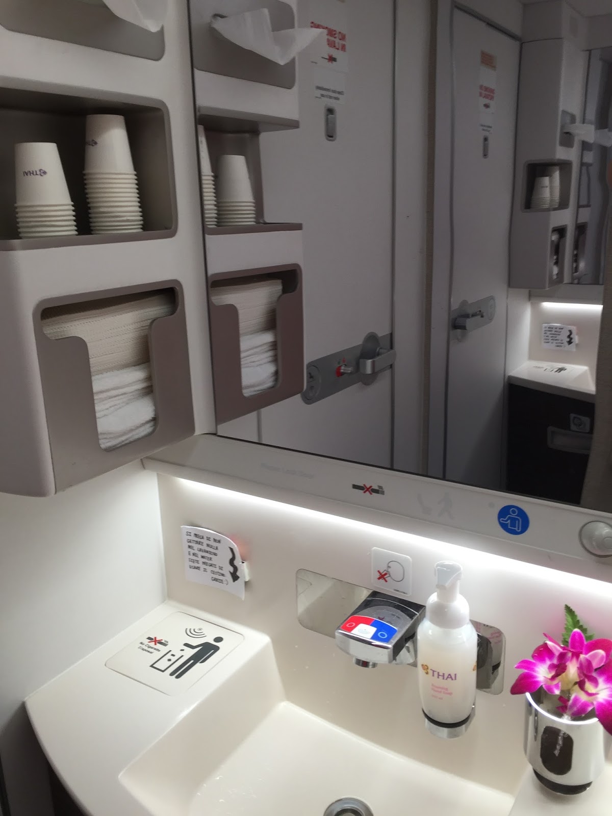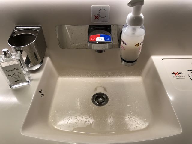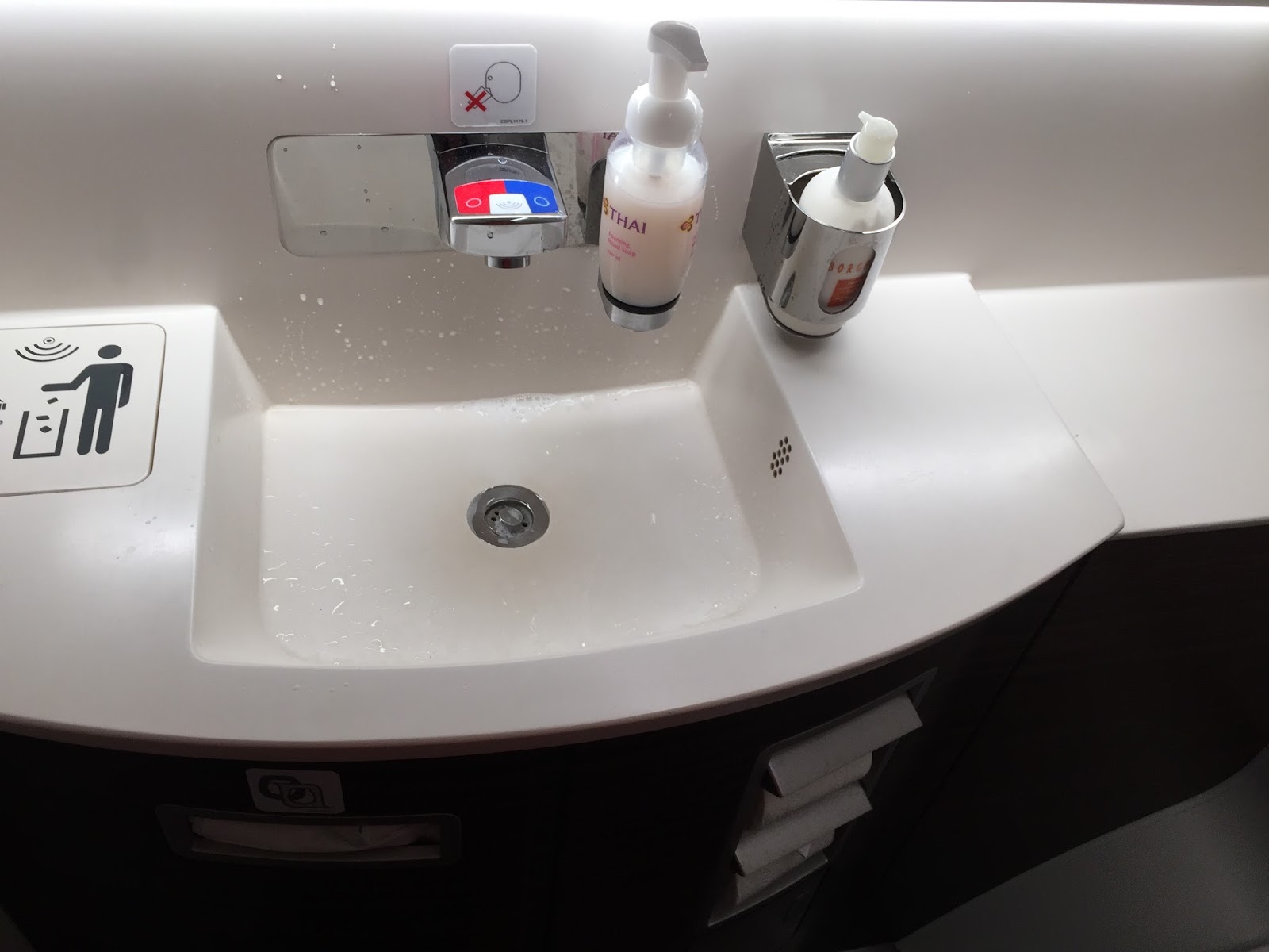 There are a few lavatories scattered across the two sections of Economy Class cabins. The lavatories are rather small and do show signs of the ageing aircraft. Unlike those on board some of the newer Thai Airways aircraft, there are no sensor activated taps on board the A330-300 aircraft. Instead, these taps utilise press buttons for both hot and cold water. Despite the ageing feel to the lavatory, the equipment is functioning well. Hand soap and cologne are the only amenities available in the Economy Class lavatory, which is slightly better than some other airlines which only supplies hand soap. Hand soap is available from the soap dispenser next to the tap.