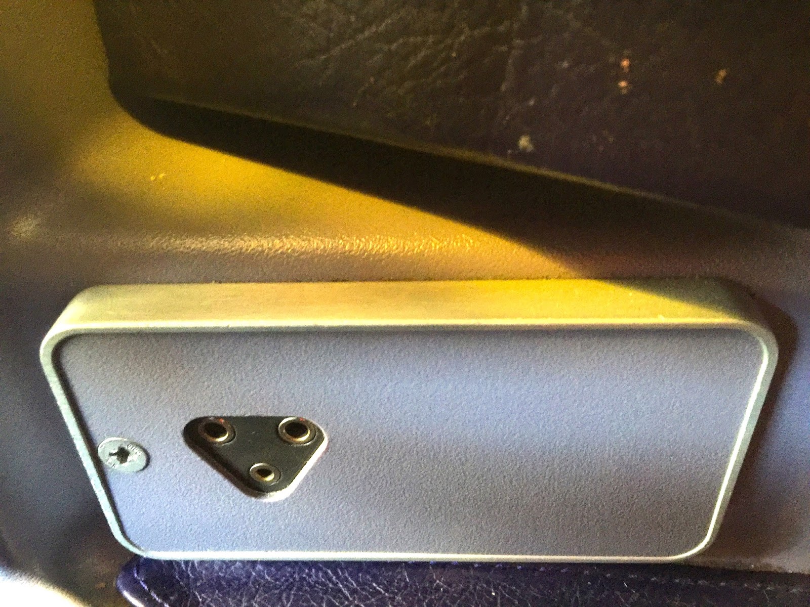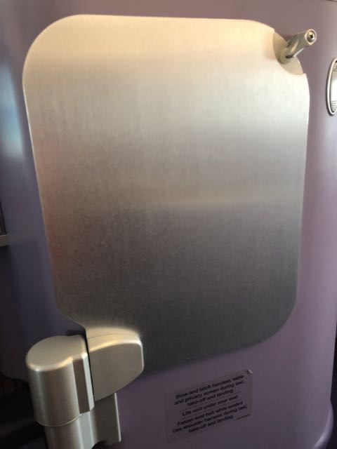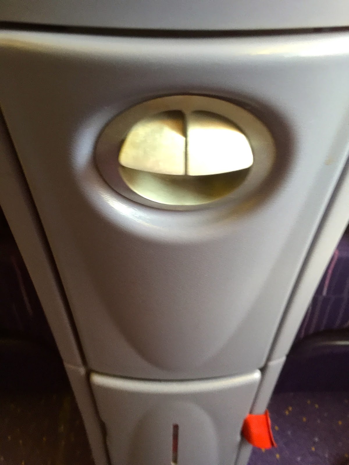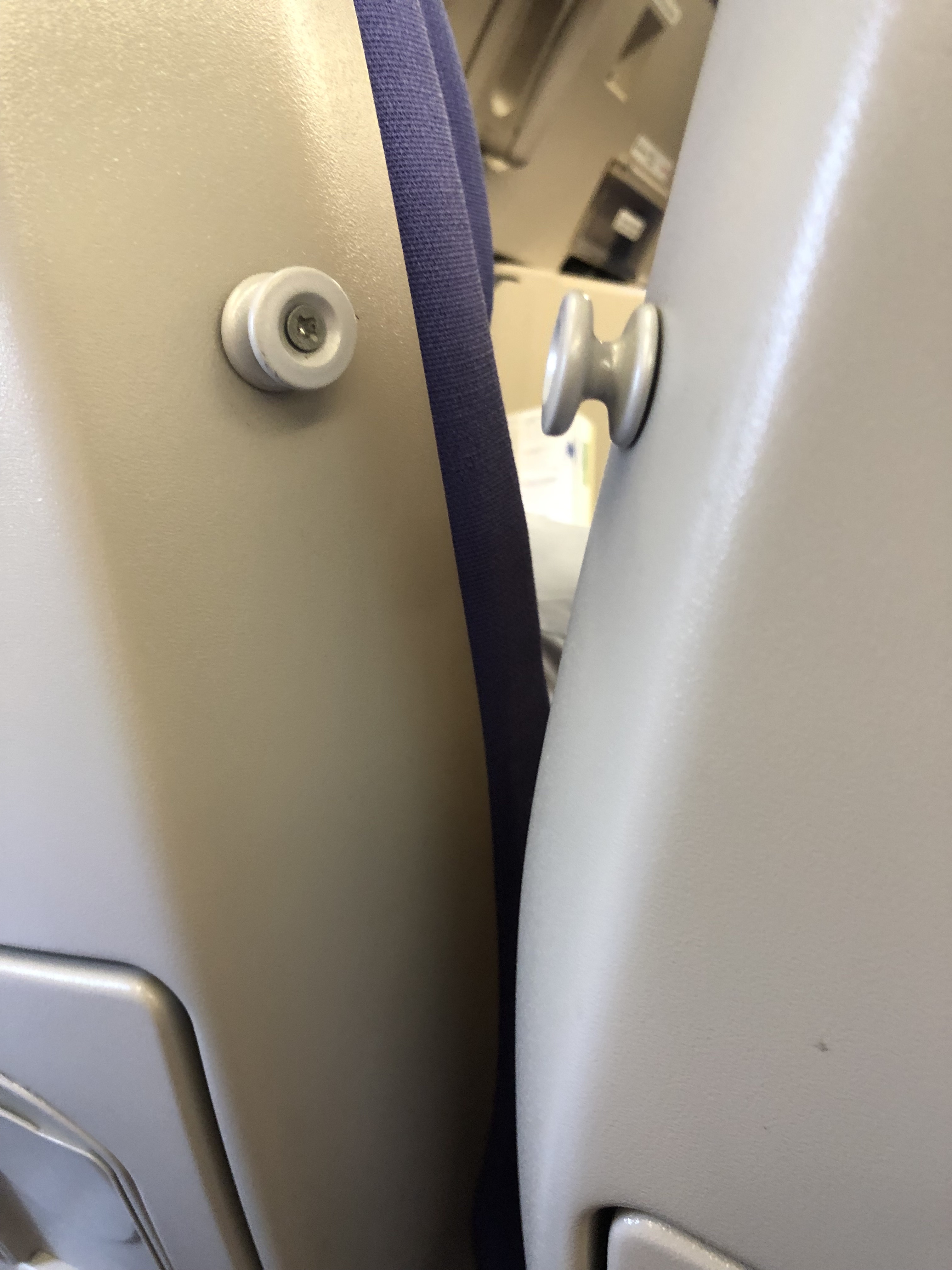 - Tray table stowed away, there is a cup holder on the underside of the tray table