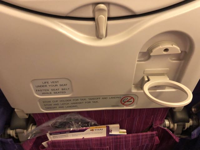 Seats in the A330-300 Economy Class cabin onboard Thai Airways has a 32″ pitch and measures 18″ wide. These seats are capable of providing a 122° recline. The seat that I was in also showed signs of ageing. The seat back feels loose and wobbly, when pressed the seat recline button, it falls back almost immediately. When I tried to set the seat back upright for meals and landing, the seat back would have to be assisted by pulling to get it set up right. Nonetheless, the seat is still comfortable for the flight from Singapore to Bangkok. The legroom in the Economy Class seats on board the Thai Airways A330-300 is rather generous, I had a fair bit amount of space from the seat in front of me. Due to the placement of the IFE system underneath the seat, I was not able to place my bag under the seat in front of me. There is a small cup holder on the back of the tray table which does not serve any purpose as it is too big to hold cans of drink or the plastic cup that Thai Airways uses.