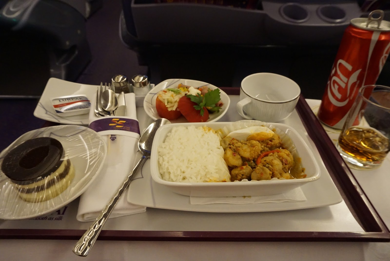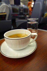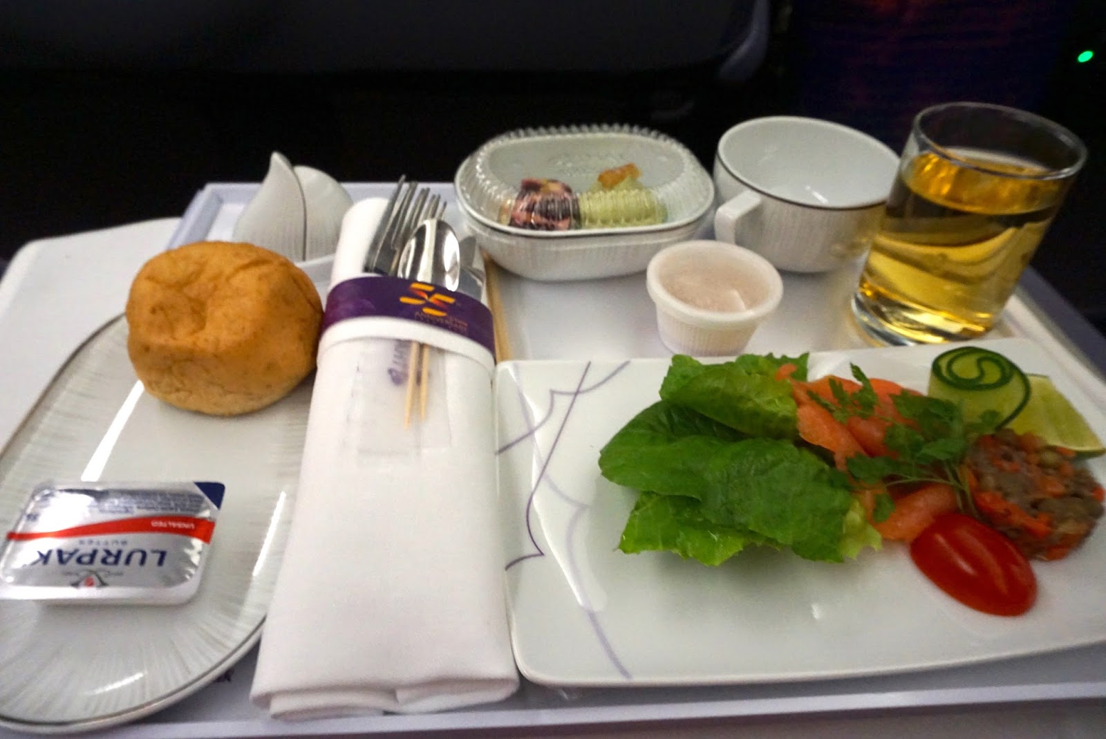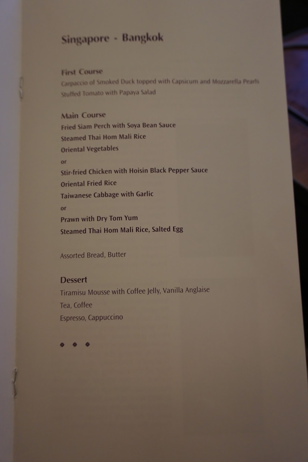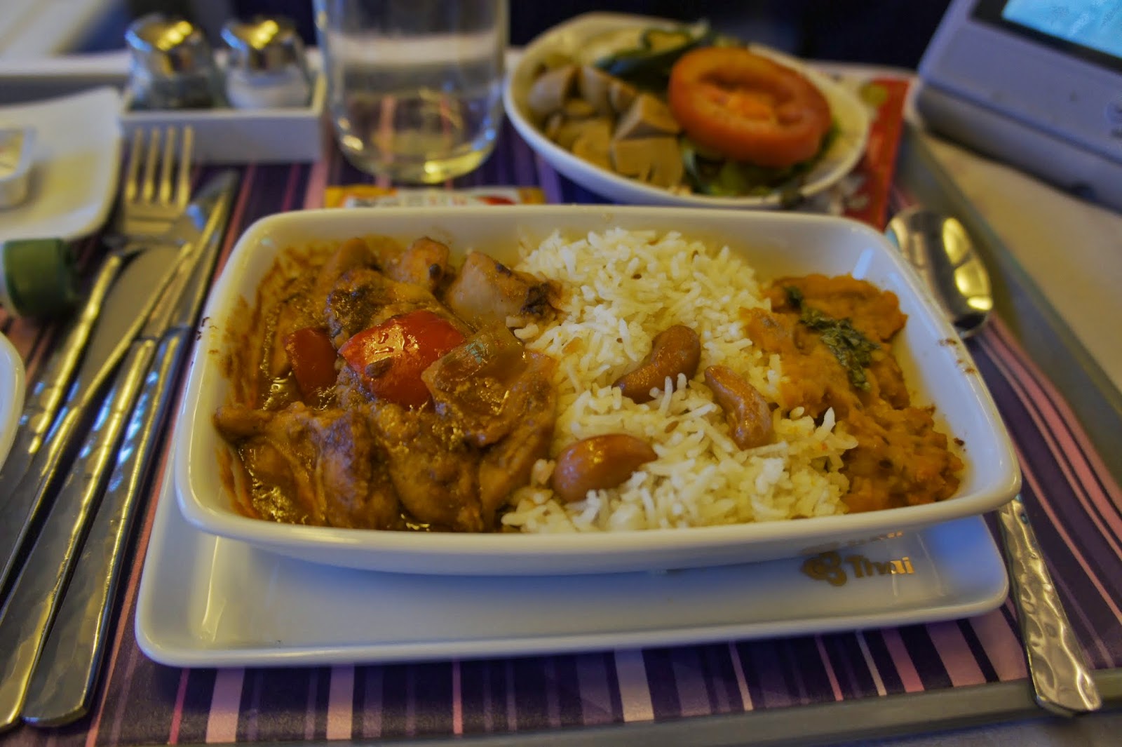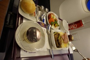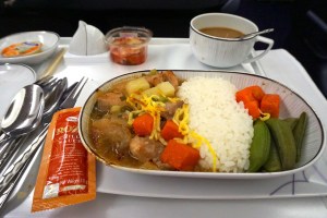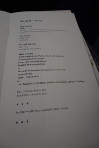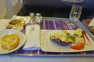 As with the previous leg, service onboard was lacklustre. The staffs are more interested in getting their job over and done with rather than making passengers feel welcome. They certainly do not live up to the company’s tagline of smooth as silk as the services rendered feels pretty rough. The attendants also did the Thai culture a disservice as they are hardly seen to be smiling at the passengers. As with the previous leg, the service felt no different from that offered in economy class. Having said that, the mechanical staffs sprung into action the moment passengers step on board and I was presented with pre-flight drinks and menu for the flight. The attendant came back shortly to take orders for food service. Meals were served course by course, which seemed pretty standard for the premium class.