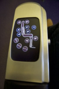 The seat is very comfortable and is capable of reclining to almost flat. The seat features an adjustable personal reading light and comes with massage functions built into the seat itself. The seat pitch is wide enough to enable me to fully stretch my legs. The distance between the seat to the personal TV is wide enough for passengers seating at the window seat to access the aisle. The seat is generally comfortable in all positions. There are pre-programmed positions on the controls of the seat as well as options for passengers to adjust the angle as one deem comfortable. The table is stowed in the armrest of the seat, which does not feel intrusive.