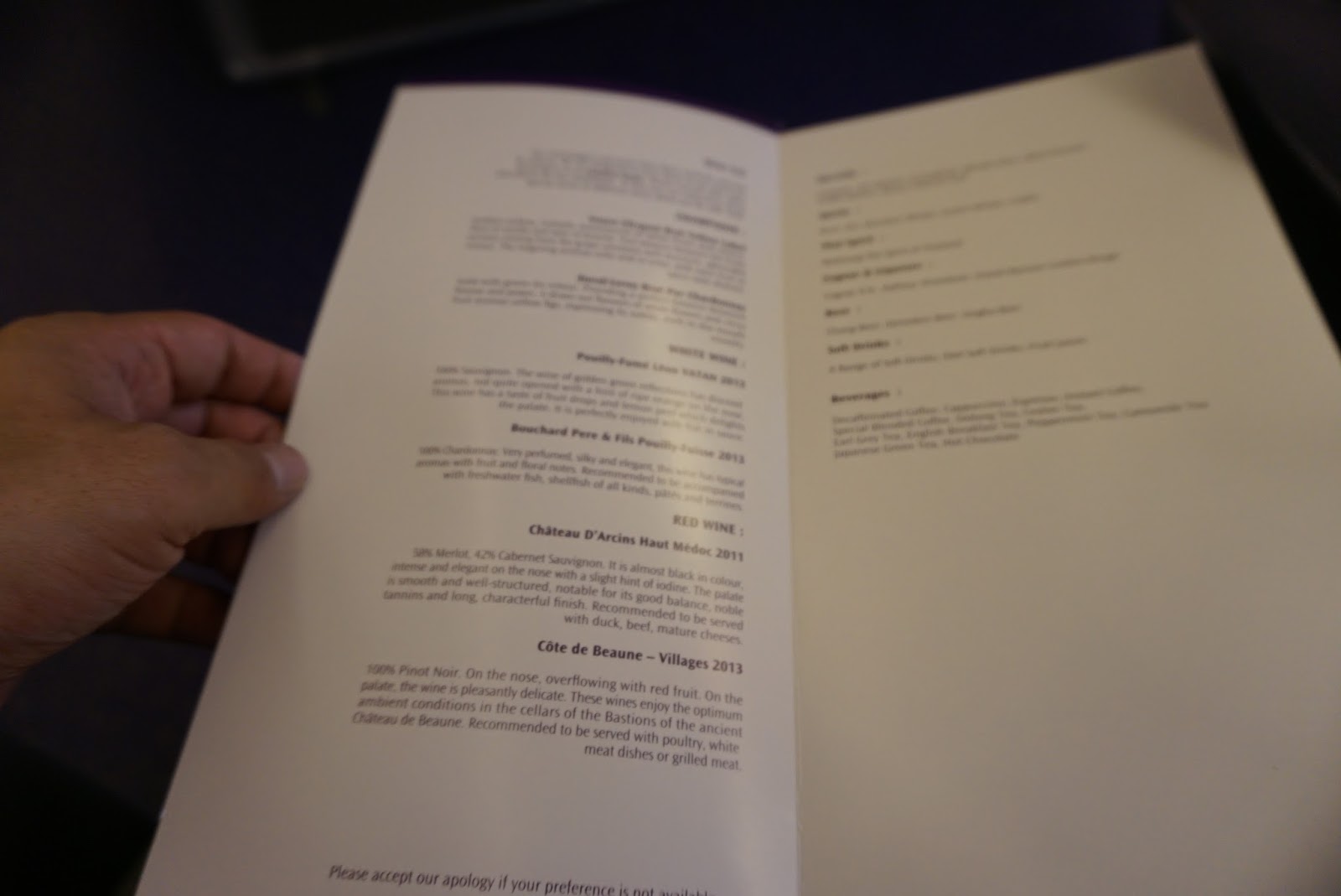 Food was rather standard and nothing fantastic. There is, however, a comprehensive list of drinks ranging from liquor to soft drinks to juices. One can also request for a cappuccino instead of the standard coffee.