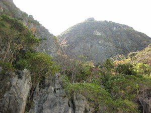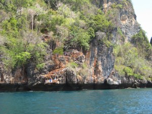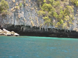 After we left Loh Samah Bay, we headed towards Pi Ley bay, or the locals call it James Bond Bay, where the area was featured in some James Bond movie some 20 years ago. However, due to low tide, we can only see the bay from outside. We were then taken to the next area, Viking cave. The guide told us the cave used to be hideout for Vikings a long time ago, however now it is bought over by some private company to harvest bird’s nest. We were prohibited to enter the caves, and only able to see from outside. I rather like the limestone formations of this cave, look like one of the hideouts you would find in some Batman movies. After leaving the Viking cave, we headed for Monkey beach. Now this beach was given this name due to numerous wild monkeys coming to the beach. As the crew tried to anchor the boat, they were unable to do so as the tide was low and the seabed was covered with rocks. In their effort to try anchoring the boat, I think they had damaged one of the 3 engines. So the coxswain told the guide (in Thai) that we will weigh anchor and head towards our lunch first before coming back here again.