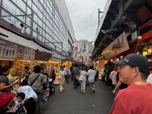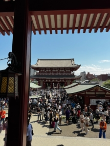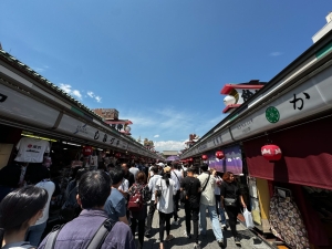 Our nightmare began after we walked past Kaminarimon Gate. We were greeted by a large horde of tourists visiting this iconic temple. To get to Sensoji Temple, we had to walk through Nakamisedori Street, the main shopping street in front of the temple. On both sides of Nakamisedori Street, we spotted numerous shops selling souvenirs, charms, clothing and some stores selling food and snacks. However, at the time of our visit, Nakamisedori Street was packed with travellers and was too crowded for us to do any meaningful shopping. Half the time, we were tussling with fellow visitors for a spot to advance closer to Sensoji Temple. The warm weather added to the discomfort we felt while walking through this gauntlet filled with stores on either side. We were not looking forward to bashing through this crowd again on our way out later in the day.